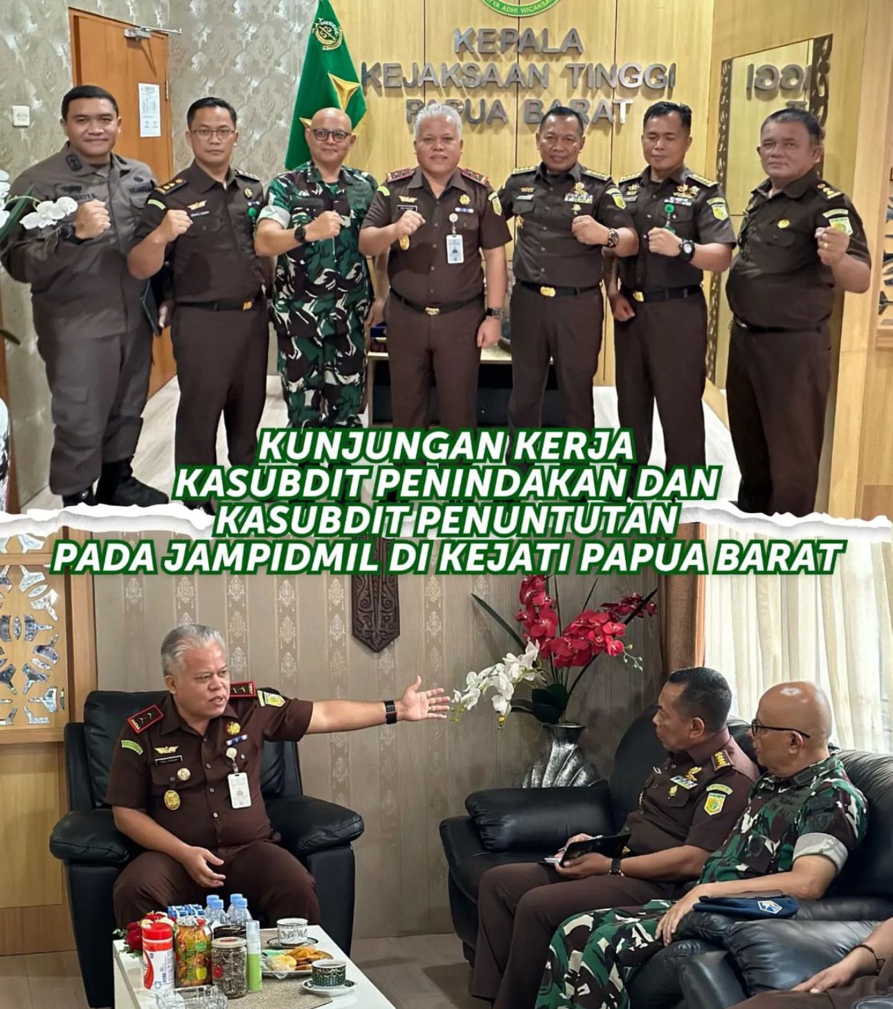 Kepala Kejaksaan Tinggi Papua Barat Dr. Harli Siregar, S.H., M.Hum didampingi Asisten Pidana Militer Kol. Laut (H) Ridho Sihombing, S.H., M.H menerima kunjungan kerja Kepala Sub Direktorat Penindakan Kol. Kum. Daswanto, S.H., M.Kn dan Kasubdit Penuntutan pada Jaksa Agung Muda Pidana Militer (JAM Pidmil) Kol. Chk. Edy Purwanto, S.H., M.H beserta tim di Kejaksaan Tinggi Papua Barat, Rabu, 17 April 2024.