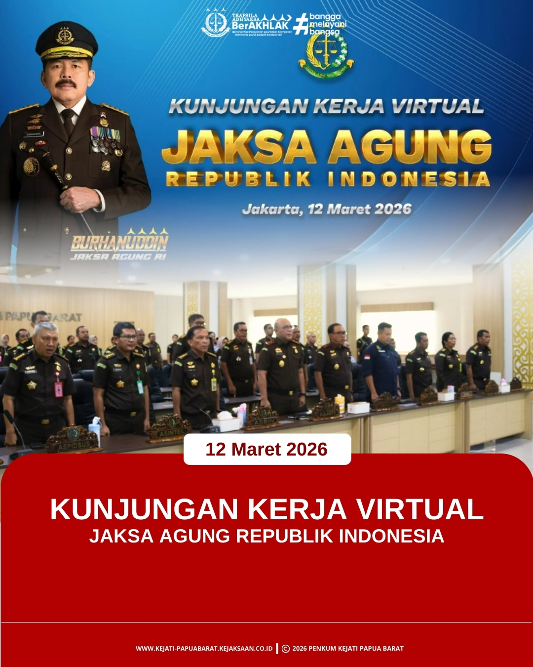 Kamis, 12 Maret 2026 pukul 12.00 WIT bertempat di Aula Kantor Kejaksaan Tinggi Papua Barat telah dilaksanakan virtual meeting Kunjungan Kerja Jaksa Agung Republik Indonesia ST Burhanuddin.