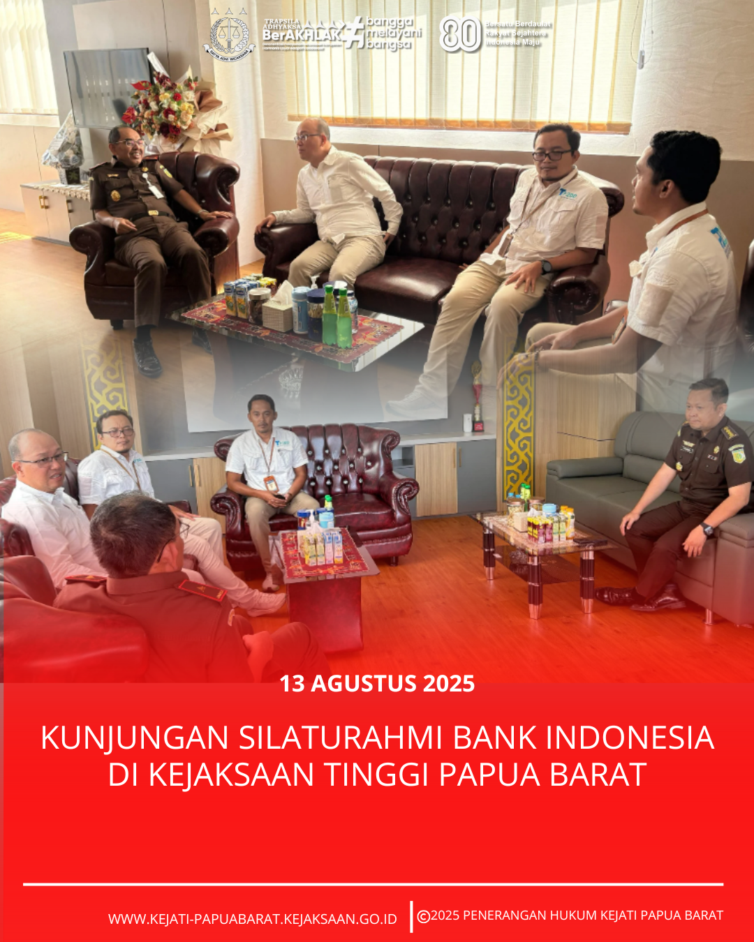 Rabu 13 Agustus 2025 bertempat di Ruang Kerja Plh. Kepala Kejaksaan Tinggi Papua Barat Dr. Muslikhuddin, S.H., M.H. didampingi Asisten Tindak Pidana Umum Dr. Priyambudi, S.H., M.H., Bank Indonesia melakukan kunjungan silaturahmi di Kejaksaan Tinggi Papua Barat.