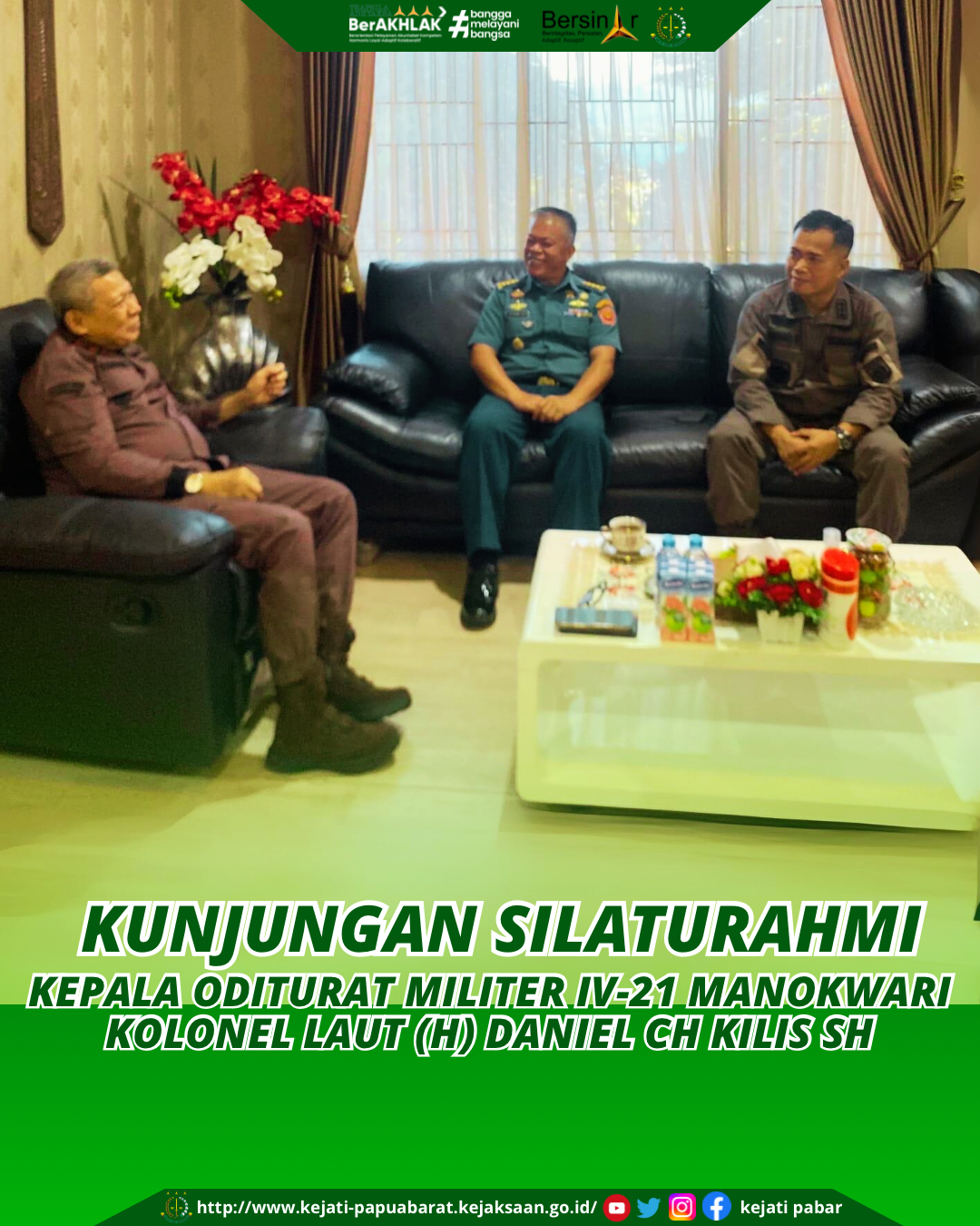 Kamis 8 Agustus 2024, Kajati Papua Barat Bpk Muhammad Syarifuddin SH,MH didampingi Aspidmil Kejati Papua Barat Kolonel Laut (H) Ridho Sihombing SH, MH menerima kunjungan silaturahmi Kepala Oditurat Militer IV-21 Manokwari Kolonel Laut (H) Daniel CH Kilis SH di ruang kerja Kajati Papua Barat.