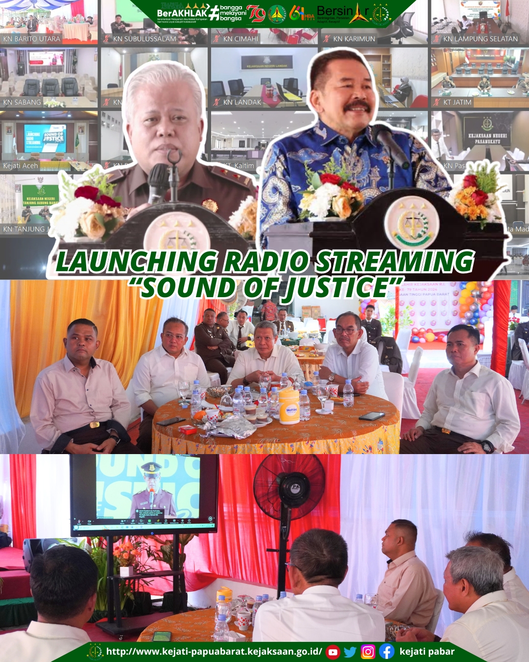 Senin, 2 September 2024 Pukul 12.00 WIT, bertempat di Halaman depan Mushollah Kejaksaan Tinggi Papua Barat. Kepala Kejaksaan Tinggi Papua Barat Muhammad Syarifuddin, S.H., M.H. dan Wakil Kepala Kejaksaan Tinggi Papua Barat Dr. Muslikhuddin, S.H., M.H. beserta Para PJU mengikuti zoom meeting dalam Launching Radio Streaming “Sound Of Justice”.