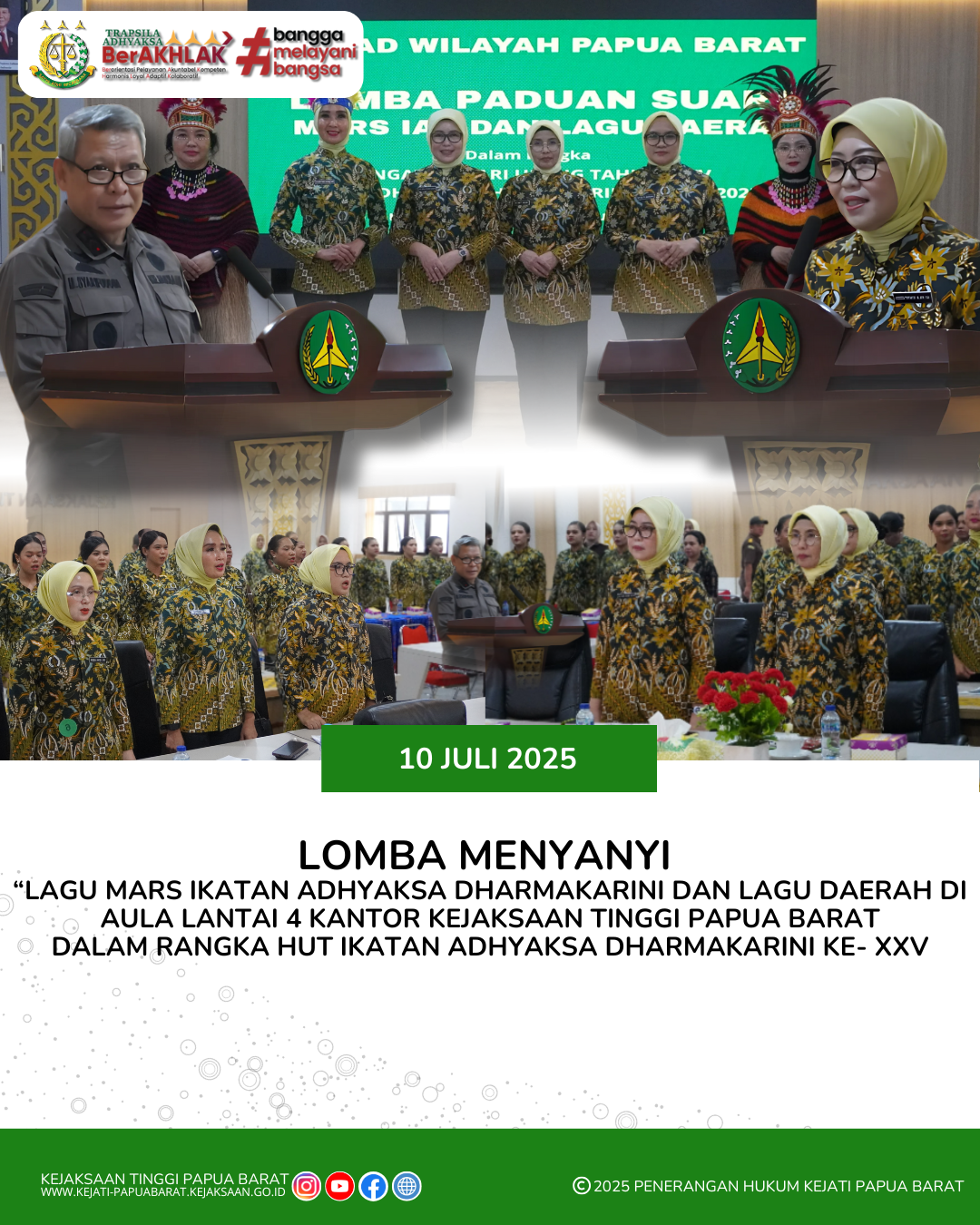 Kamis, 10 Juli 2025 bertempat di Aula Lantai 4 Kantor Kejaksaan Tinggi Papua Barat dilaksanakan Lomba Menyanyi Lagu Mars IAD dan Lagu Daerah dalam rangka HUT Ikatan Adhyaksa Dharmakarini ke- 25.
