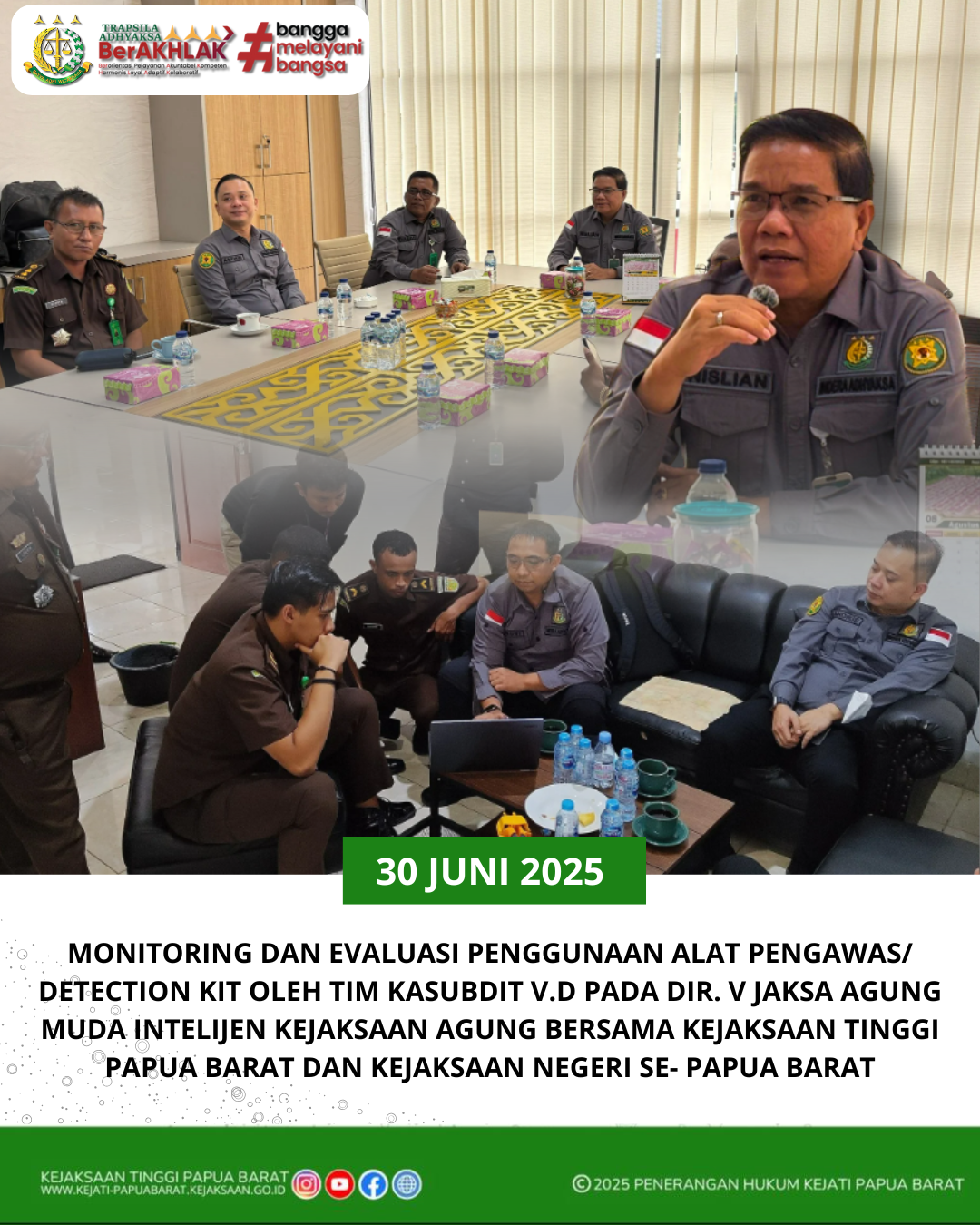 Selasa, 30 Juli 2025 bertempat di Ruang Rapat Bidang Inteijen Kejaksaan Tinggi Papua, Kejaksaan Negeri Manokwari, serta Kejaksaan Negeri Se- Papua Barat secara virtual melaksanakan Monitoring dan Evaluasi penggunaan alat pengawas/ Detection Kit oleh Kasubdit V.D pada Direktorat V Jaksa Agung Muda Intelijen Kejaksaan Agung.