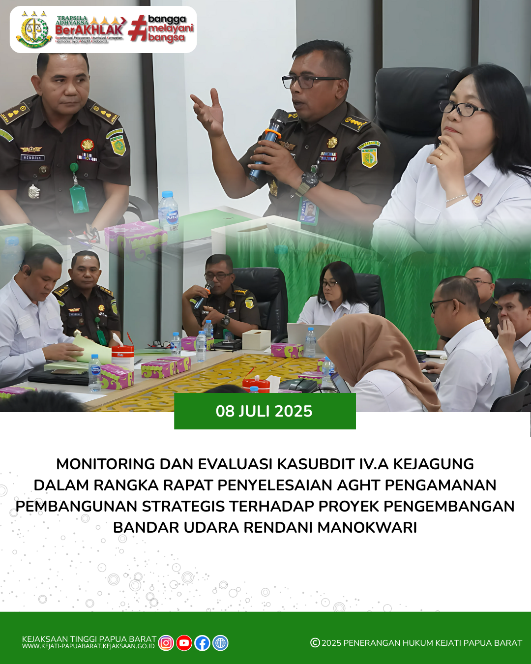 Selasa Juli 2025 bertempat di Ruang Vicon Lantai 2 Kantor Kejaksaan Tinggi Papua Barat dilaksanakan Monitoring dan Evaluasi kasubdit IV.A Kejaksaan Agung dalam rangka Rapat Penyelesaian AGHT Pengamanan Pembangunan Strategis terhadap Proyek Pengembangan Bandar Udara Rendani Manokwari bersama Asisten Intelijen, Koordinator dan para Kasi bidang Intelijen Kejaksaan Tinggi Papua Barat dan Kejaksaan Negeri Manokwari.