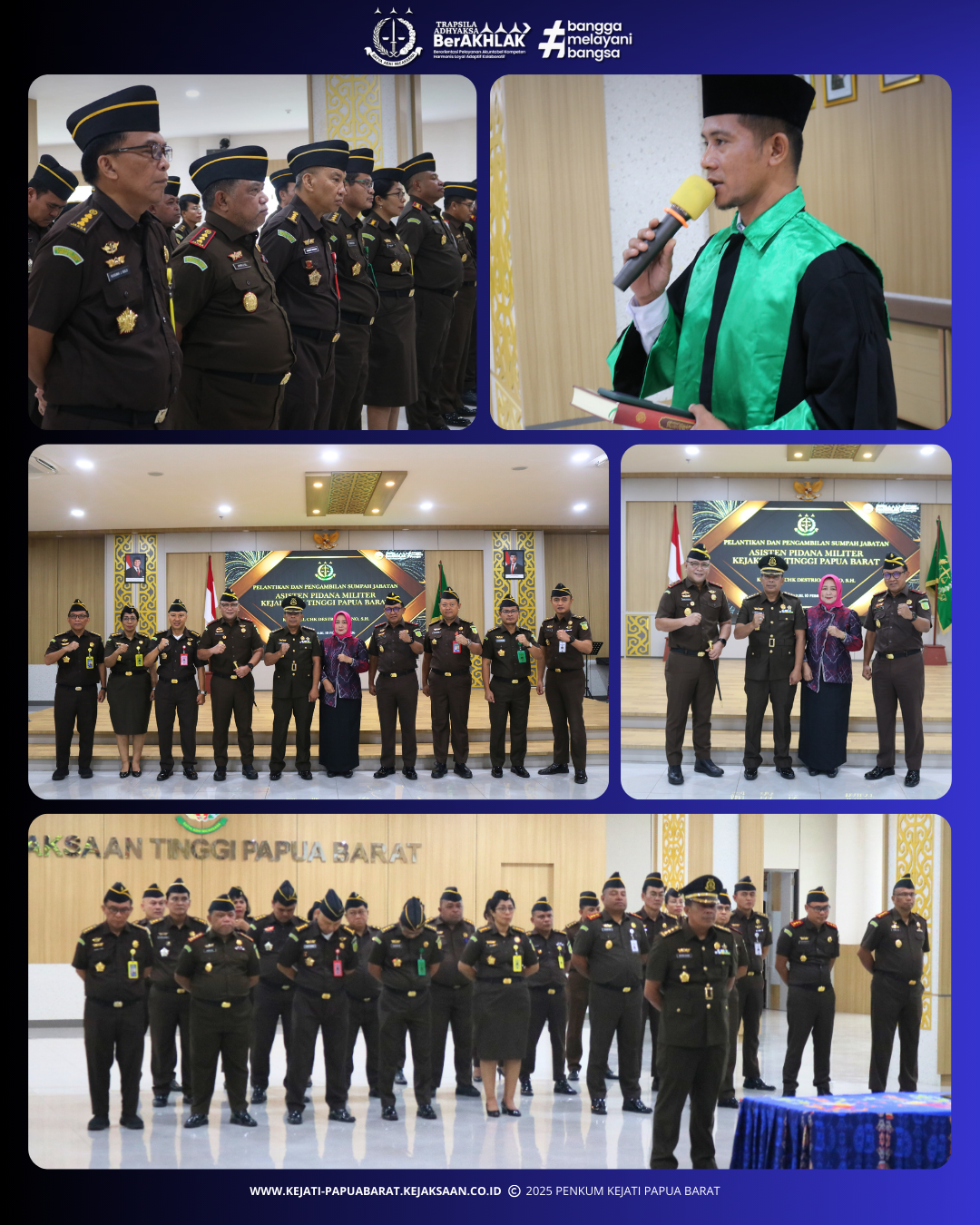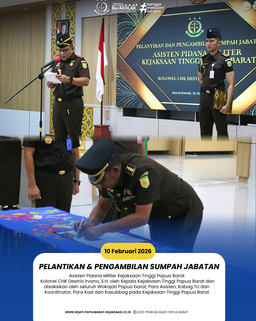 Selasa 10 Februari 2025 pukul 09.30 WIT bertempat di Aula Lantai 4 Kantor Kejaksaan Tinggi Papua Barat, Kepala Kejaksaan Tinggi Papua Barat Pimpin Pelantikan dan Pengambilan Sumpah Jabatan Asisten Pidana Militer Kejaksaan Tinggi Papua Barat Kolonel CHK Destrio Irvano, S.H.