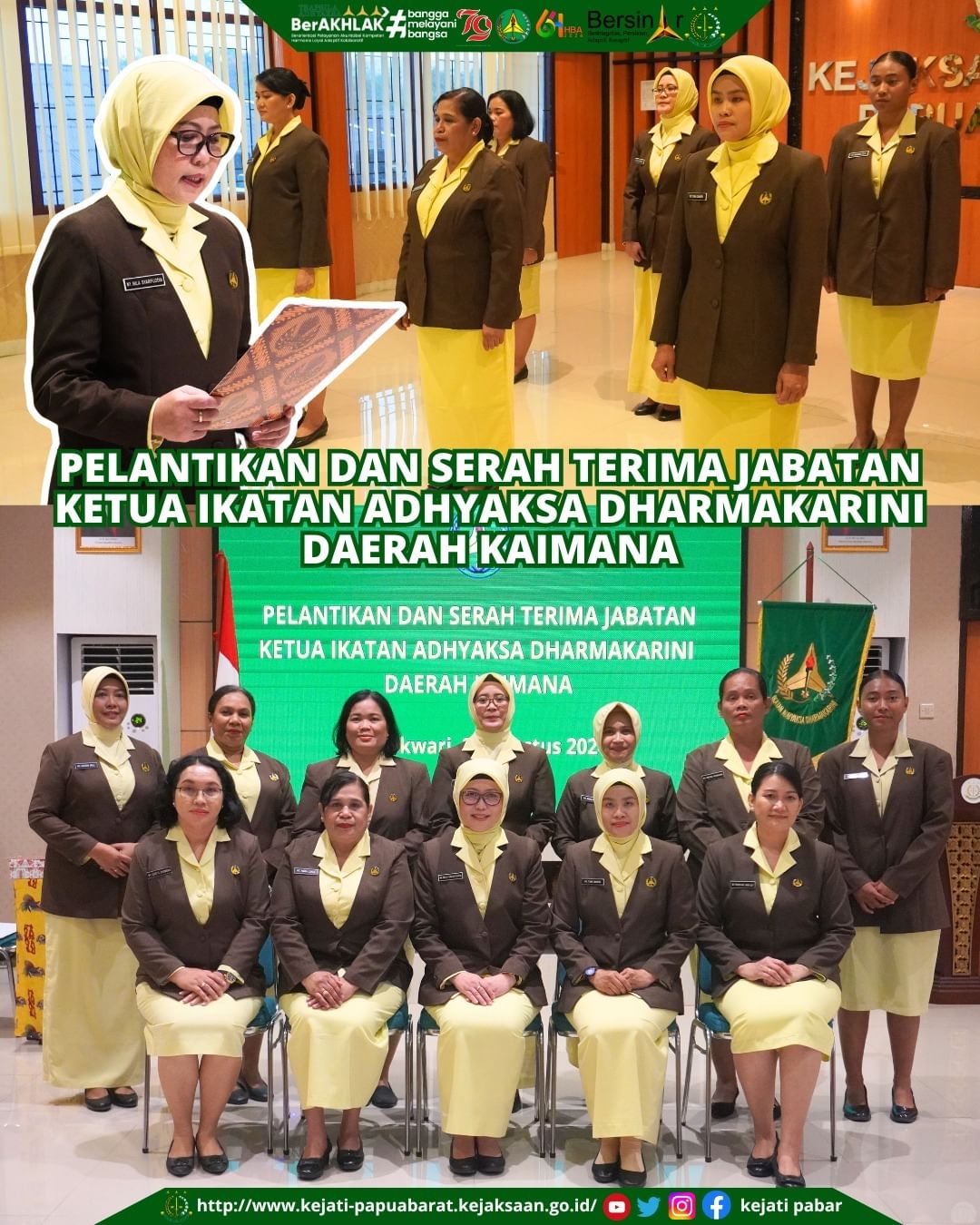 Kamis, 29 Agustus 2024, bertempat di Aula Kantor Kejaksaan Tinggi Papua Barat, Ketua Ikatan Adhyaksa Dharmakarini Wilayah Papua Barat Milla Syarifuddin melantik Ketua Ikatan Adhyaksa Dharmakarini Daerah Kaimana Tina Rio Rosaline.