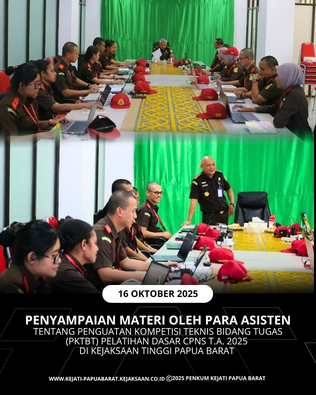 Rabu 15 Oktober 2025 Pukul 09.45 WIT bertempat di Ruang Vicon Lantai 2 Kantor Kejaksaan Tinggi Papua Barat, Calon Pegawai Negeri Sipil (CPNS) T.A 2025 di Kejaksaan Tinggi Papua Barat mengikuti Pembelajaran Materi tentang Penguatan Kompetisi Teknis Bidang Tugas (PKTBT) Pelatihan Dasar (Latsar) CPNS T.A. 2025.