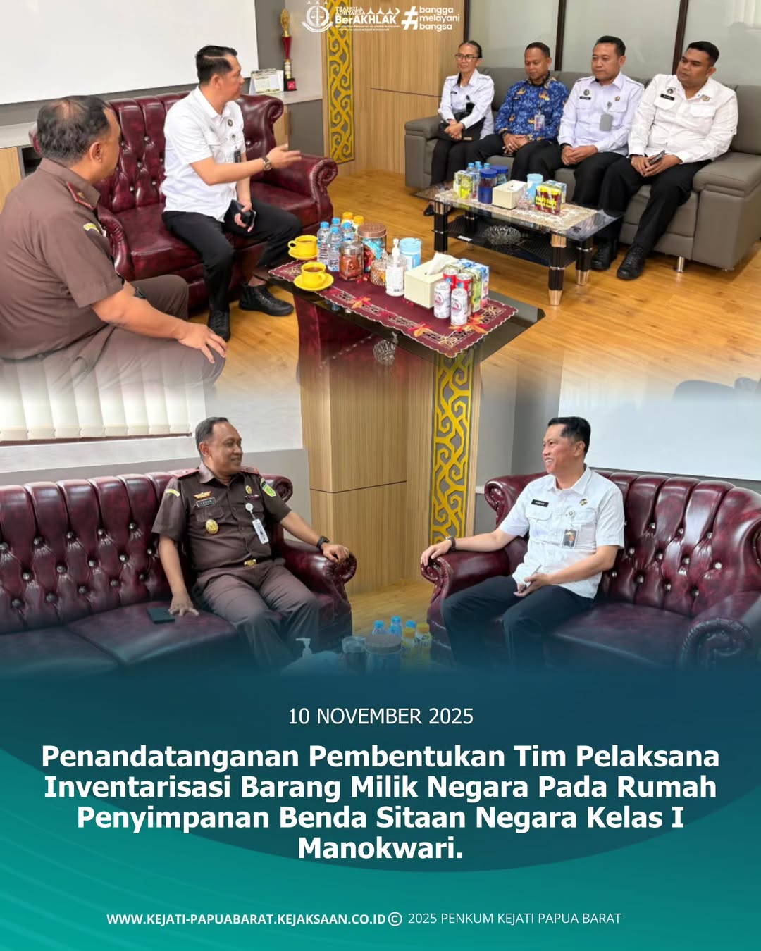 Pada hari Senin, 10 November 2025 bertempat di Ruang Kerja Plh. Kepala Kejaksaan Tinggi Papua Barat, telah dilakukan penandatanganan Pembentukan Tim Pelaksana Inventarisasi Barang Milik Negara (BMN) pada Rumah Penyimpanan Benda Sitaan Negara (RUPBASAN) Kelas I Manokwari oleh Kejaksaan Tinggi Papua Barat bersama Kantor Wilayah Direktorat Jenderal Pemasyarakatan Papua Barat.