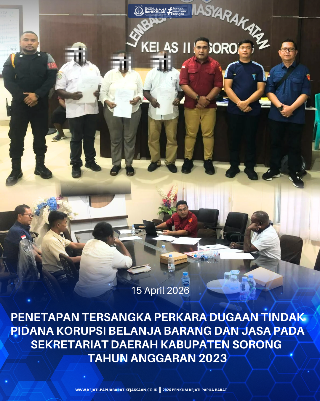 Pada hari ini Rabu tanggal 15 April 2026 bertempat di Kantor Kejaksaan Tinggi Papua Barat, Penyidik Kejaksaan Tinggi Papua Barat setelah melakukan serangkaian tindakan penyidikan Berdasarkan Surat Perintah Penyidikan Kajati Papua Barat telah menetapkan beberapa pihak sebagai Tersangka dalam perkara Tindak Pidana Korupsi Tindak Pidana Korupsi Belanja Barang Dan Jasa pada Sekretariat Daerah Kab. Sorong TA. 2023, adapun para pihak tersebut adalah :