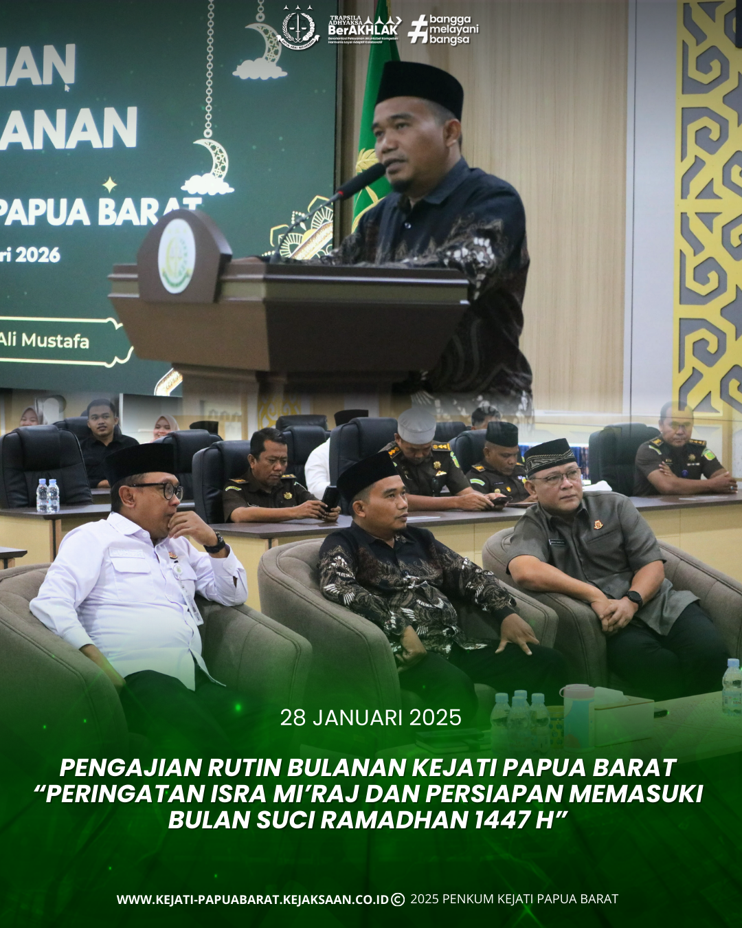 Rabu, 28 Januari 2025 pukul 09.30 WIT bertempat di Aula Lantai 4 Kantor Kejaksaan Tinggi Papua Barat, Keluarga Besar Kejaksaan Tinggi Papua Barat yang beragama Islam melaksanakan Pengajian Rutin dengan tema “Peringatan Isra Mi’raj dan Persiapan Memasuki Bulan Suci Ramadhan 1447”.