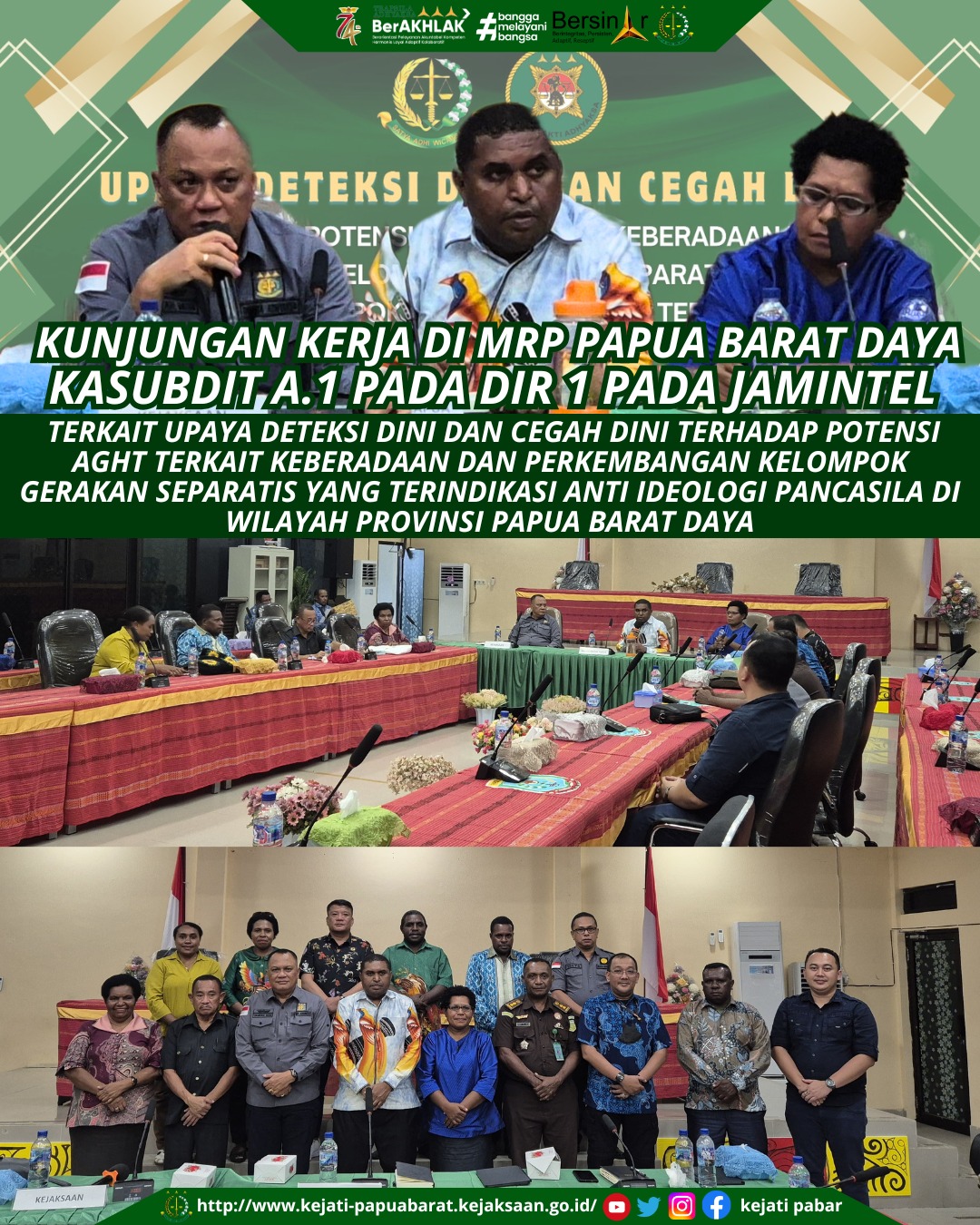 Senin, 02 Mei 2025 bertempat di Aula Kantor MRP Papua Barat Daya dilaksanakan Pengarahan dan Kunjungan Kerja Kasubdit I.A Pada Jaksa Agung Muda Intelijen terkait upaya deteksi dini dan cegah dini pemetaan potensi AGHT terkait keberadaan dan perkembangan kelompok gerakan separatis dan/ atau kelompok-kelompok lain yang diduga terindikasi anti ideologi Pancasila di wilayah Provinsi Papua Barat Daya.