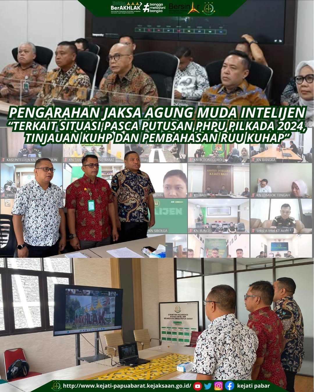 Jumat 14 Februari 2025 bertempat di Rua Vicon Bidang Intelijen Kejaksaan Tinggi Papua Barat, Asisten Intelijen Muhammad Bardan, S.H., M.H. didampingi Koordinator 6 Toman E.L. Ramandey, S.H., M.H. dan Kasi I Bidang Intel Mathys Adrien Rahanra, S.H., M.H. mengikuti kegiatan Vicon Pengarahan jaksa agung muda intelijen “terkait situasi pasca putusan phpu pilkada 2024, tinjauan kuhp dan pembahasan ruu kuhap”.