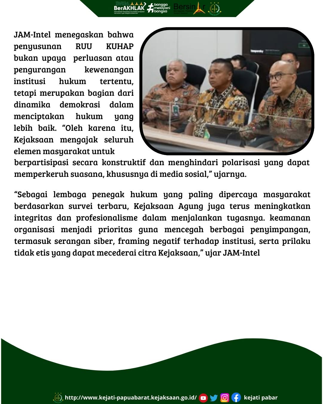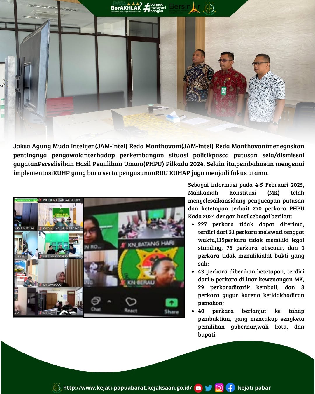 Jaksa Agung Muda Intelijen (JAM-Intel) Reda Manthovani menegaskan pentingnya pengawalan terhadap perkembangan situasi politik pasca putusan sela/dismissal gugatan Perselisihan Hasil Pemilihan Umum (PHPU) Pilkada 2024. Selain itu, pembahasan mengenai implementasi KUHP yang baru serta penyusunan RUU KUHAP juga menjadi fokus utama.