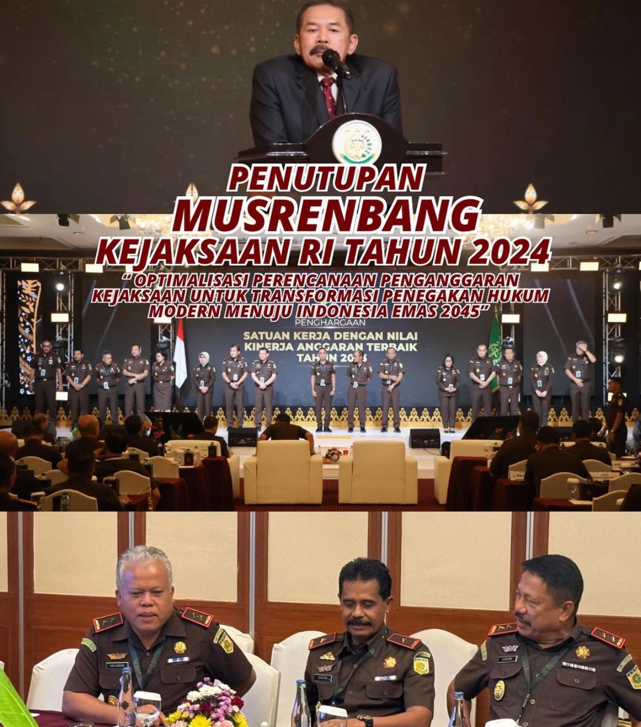 Jaksa Agung berterima kasih dan mengapresiasi kerja Sekretaris Jaksa Agung Muda Pembinaan Dr. Mohamad Dofir selaku Ketua Umum Musrenbang Kejaksaan RI Tahun 2024 beserta jajaran kepanitiaan atas penyelenggaraan acara ini yang telah berjalan baik dan lancar.