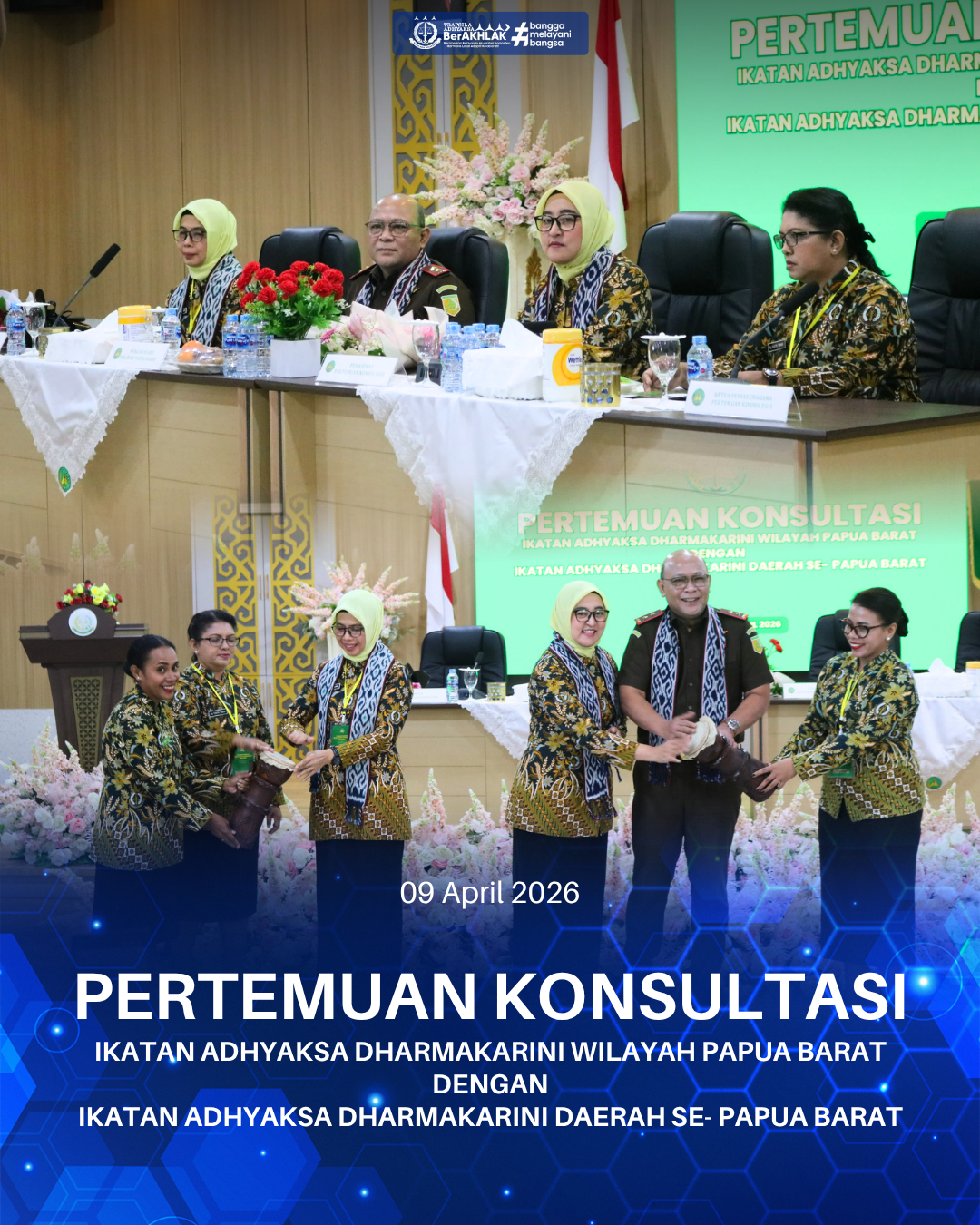 Kamis 9 April 2026 pukul 09.30 WIT bertempat di Aula Lantai 4 Kantor Kejaksaan Tinggi Papua Barat, Kepala Kejaksaan Tinggi Papua Barat Basuki Sukardjono, S.H., M.H. selaku Pengawas Ikatan Adhyaksa Dharmakarini didampingi Ketua Ikatan Adhyaksa Dharmakarini melaksakan Pertemuan Konsultasi Ikatan Adhyaksa Darmakarini Wilayah Papua Barat dengan Ikatan Adhyaksa Dharmakarini Daerah Se- Papua Barat.