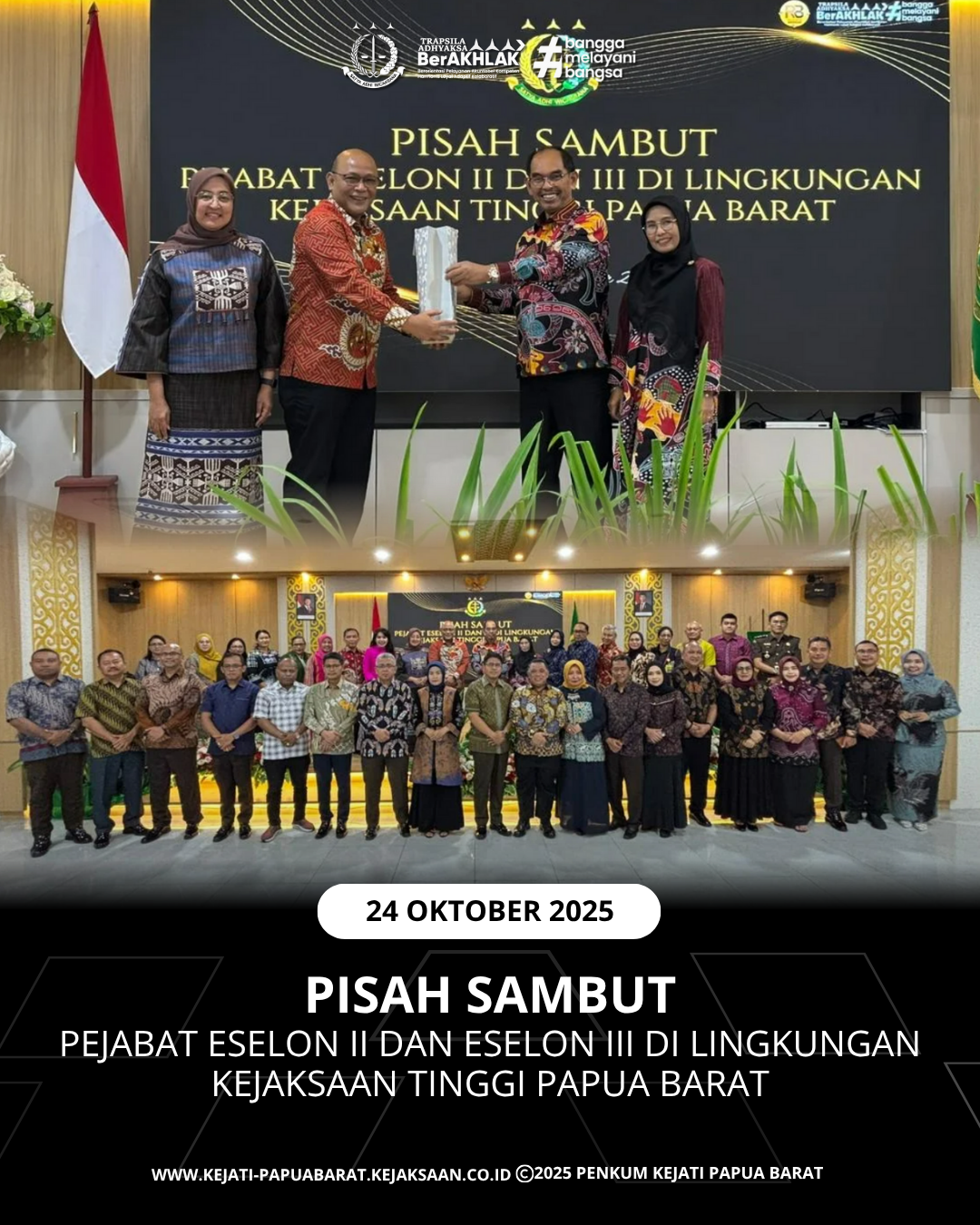 Pada hari Jumat 24 Oktober 2025, bertempat di Aula Lantai 4 Kantor Kejaksaan Tinggi Papua Barat dilaksanakan Pisah Sambut Pejabat Eselon II dan Eselon III di Lingkungan Kejaksaan Tinggi Papua Barat.