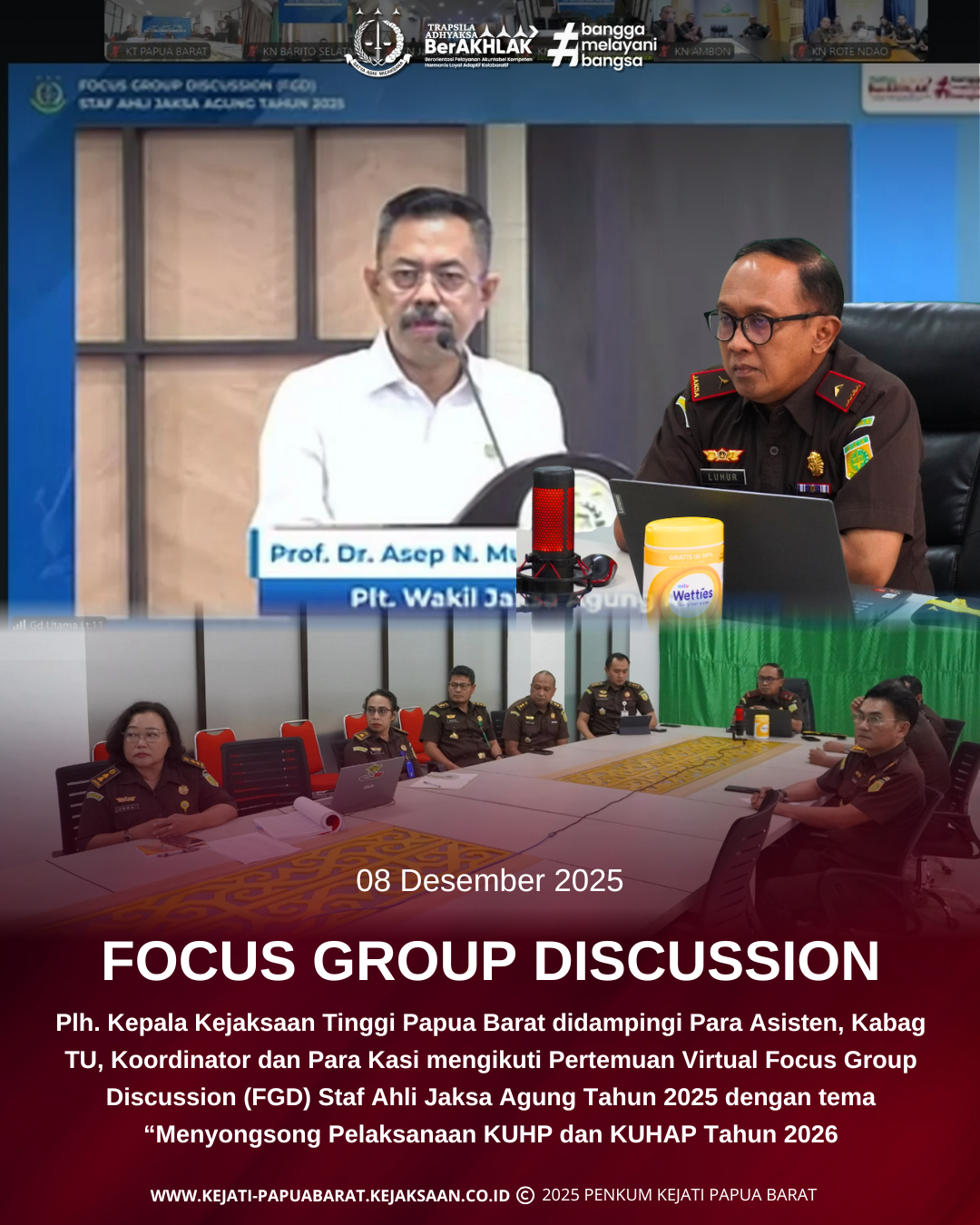 Senin 08 Desember 2025 bertempat di Ruang Vicon Lantai 2 Kantor Kejaksaan Tinggi Papua Barat, Plh Kepala Kejaksaan Tinggi Papua Barat Luhur Istighfar, S.H., M.H. didampingi para Asisten, Kabag TU, Koordinator dan Para Kasi mengikuti Pertemuan Virtual Focus Group Discussion (FGD) Staf Ahli Jaksa Agung Tahun 2025 dengan tema “Menyongsong Pelaksanaan KUHP dan KUHAP tahun 2026”.