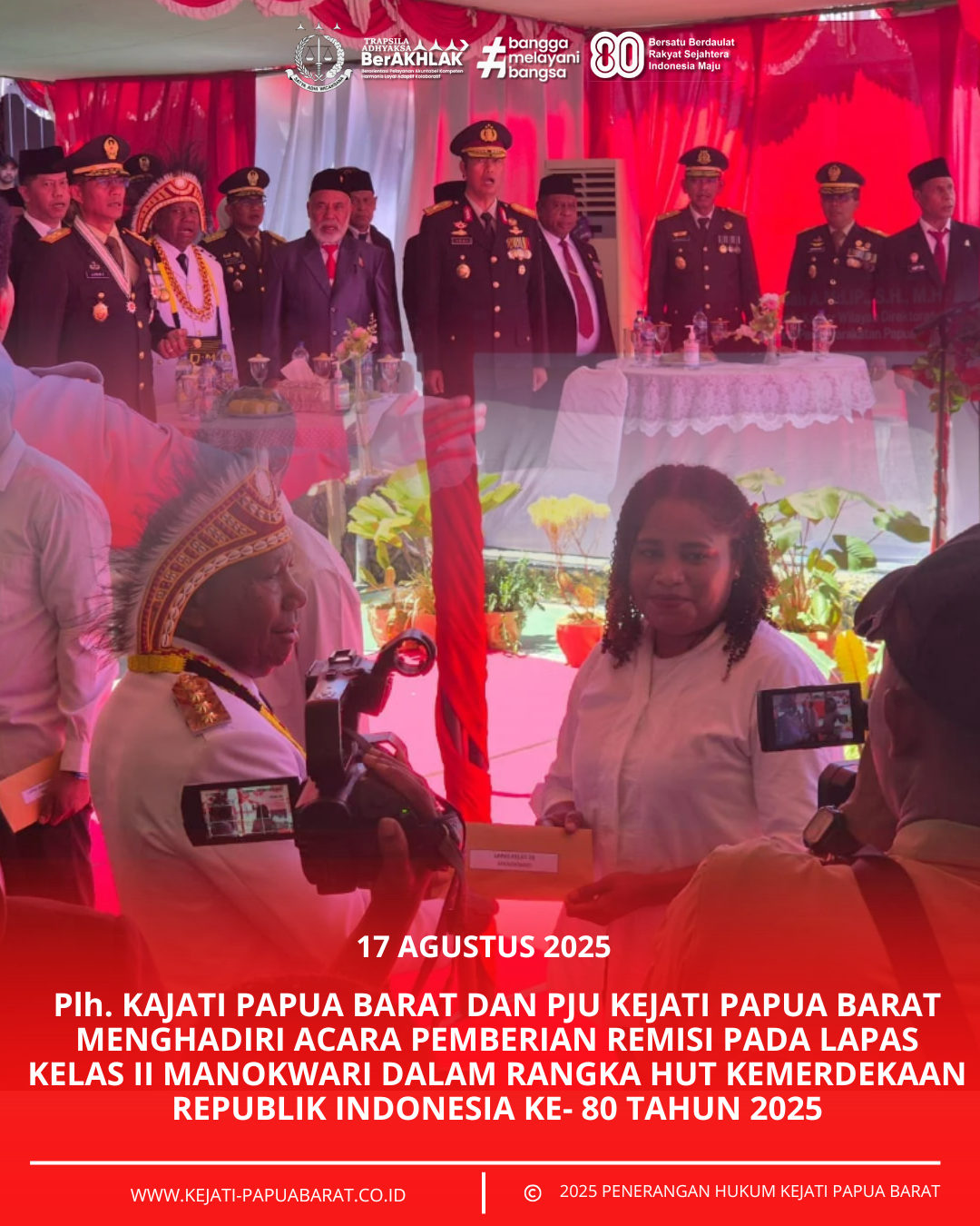 Minggu 17 Agustus 2025 bertempat di Kantor Lapas Kelas II Manokwari, Plh. Kepala Kejaksaan Tinggi Papua Barat menghadiri Pemberian Remisi pada tahanan oleh Gubernur Provinsi Papua Barat dalam rangka HUT Kemerdekaan Republik Indonesia Ke- 80 Tahun 2025.