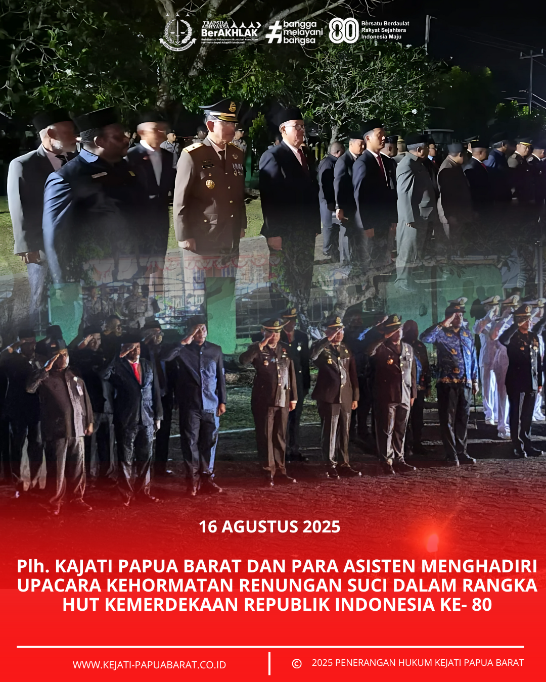 Sabtu 16 Agustus 2025 bertempat di Taman Makam Pahlawan, Plh. Kajati Papua Barat dan Para Asisten menghadiri Upacara Kehormatan Renungan Suci dengan tujuan untuk mengingat jasa para pahlawan yang telah berjuang untuk kemerdekaan Republik Indonesia.