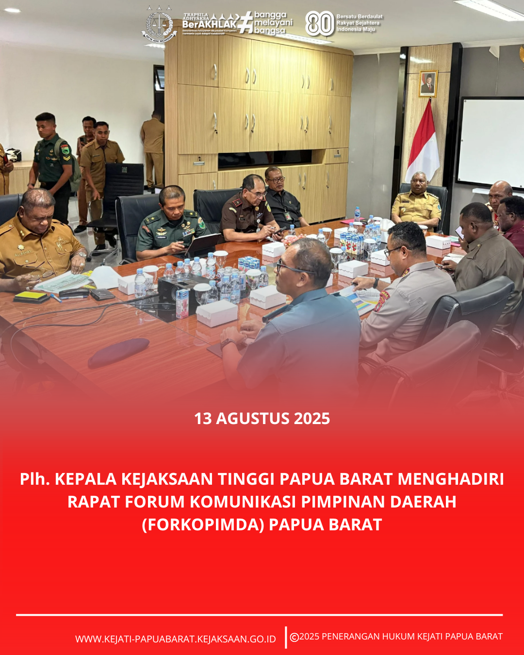 Rabu 13 Agustus 2025 bertempat di Lantai 4 Ruang Rapat Wakil Gubernur Papua Barat, Plh. Kepala Kejaksaan Tinggi Papua Barat Dr. Muslikhuddin, S.H., M.H. menghadiri Rapat Forum Komunikasi Pimpinan Daerah (Forkopimda) Papua Barat.