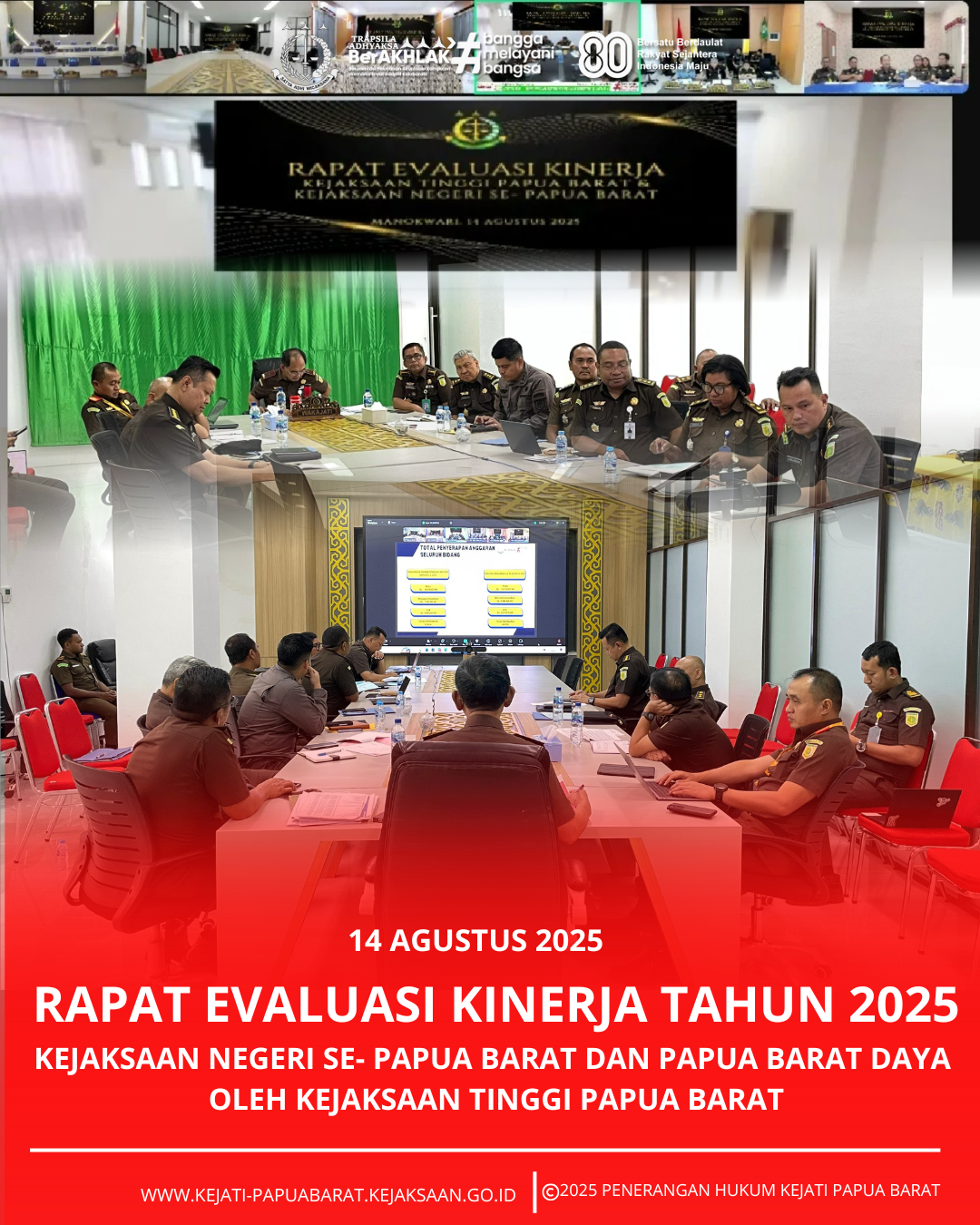 Kamis 14 Agustus 2025 bertempat di Ruang Vicon Lantai 2 Kantor Kejaksaan Tinggi Papua Barat, Plh. Kepala Kejaksaan Tinggi Papua Barat Dr. Muslikhuddin, S.H., M.H. memimpin Rapat Evaluasi Kinerja Tahun 2025, yang terdiri dari :