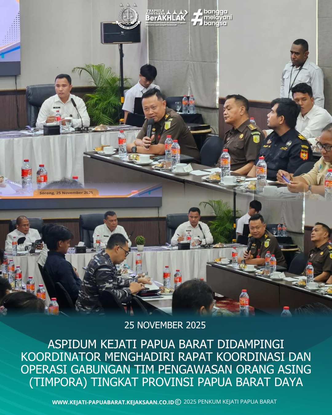 Pada hari Senin 25 November 2025 bertempat di Kota Sorong, Asisten Tindak Pidana Umum Dr. Priyambudi, S.H., M.H. didampingi Koordinator Kejaksaan Tinggi Papua Barat Yoseph Umbu Hina Marawali, S.H. menghadiri Rapat Koordinasi dan Operasi Gabungan Tim Pengawasan Orang Asing (Tim Pora) Tingkat provinsi Papua Barat Daya dengan agenda “Penyampaian perkembangan isu aktual terkait keberadaan dan kegiatan orang asing”.