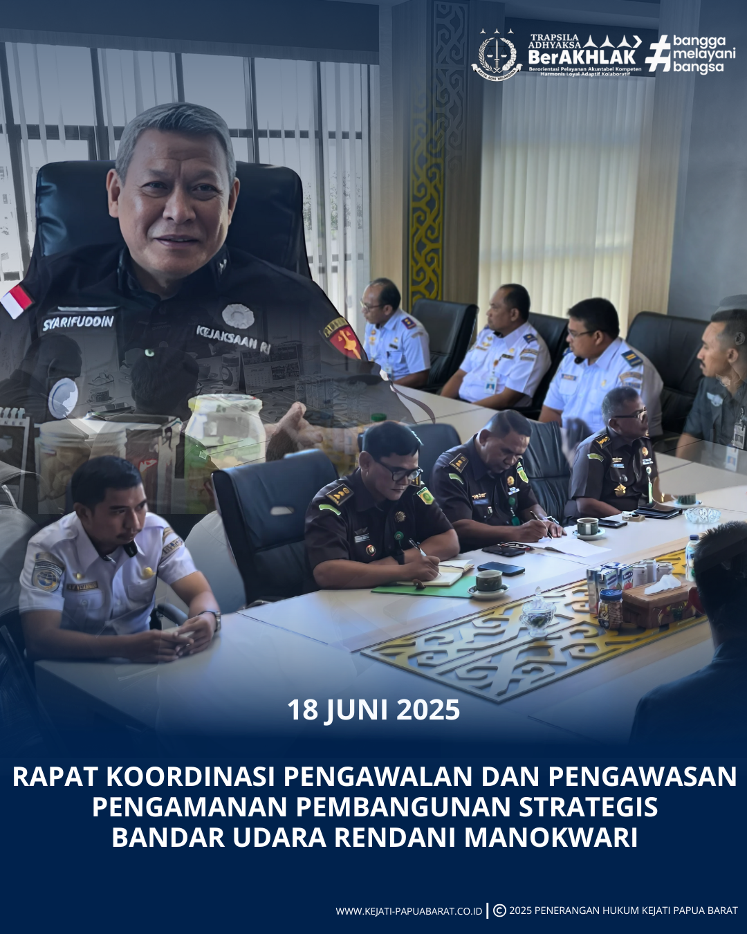 Rabu 18 Juni 2025 bertempat di Ruang Kerja Kepala Kejaksaan Tinggi Papua Barat, telah dilaksanakan Rapat Koordinasi Pengawalan dan Pengawasan Pengamanan Pembangunan Strategis Bandar Udara Rendani Manokwari.