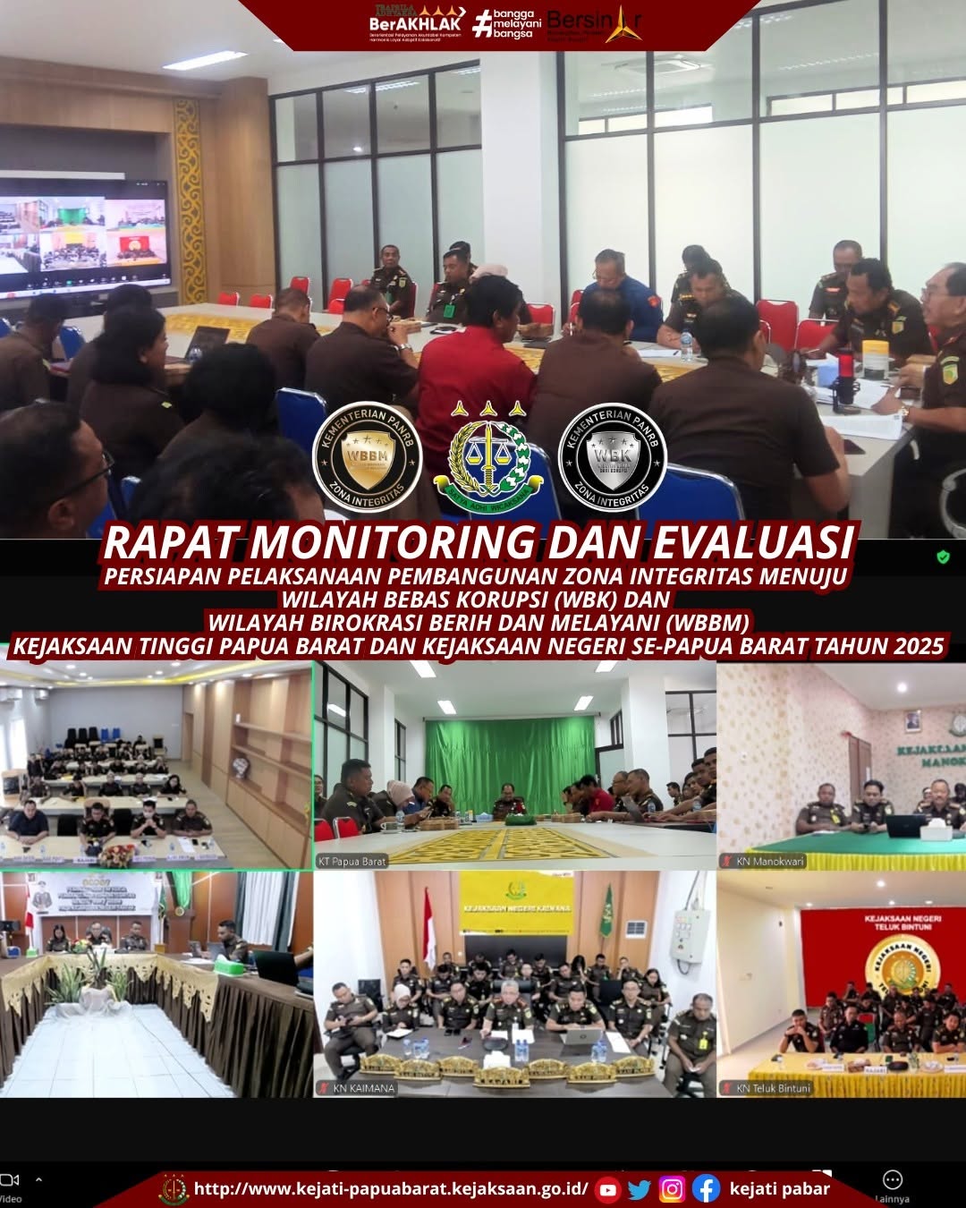 Rabu, 22 Januari 2025 bertempat di Ruang Vicon Lantai Dua Kantor Kejaksaan Tinggi Papua Barat, Wakil Kepala Kejaksaan Tinggi Papua Barat Dr. Muslikhuddin, S.H., M.H. memimpin Rapat Monitoring dan Evaluasi Persiapan Pelaksaan Pembangunan Zona Integritas Menuju Wilayah Bebas Korupsi (WBK) dan Wilayah Birokrasi Bersih dan Melayani (WBBM) di Kejaksaan Tinggi Papua Barat dan Kejaksanaan Negeri Se-Papua Barat Tahun 2025.