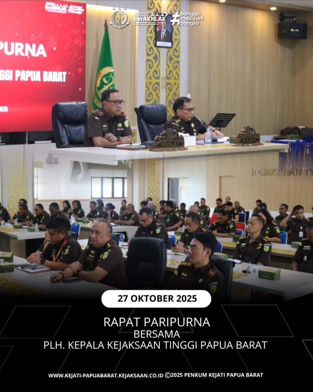 Pada hari Senin, 27 Oktober 2025 bertempat di Aula Lantai 4 kantor Kejaksaan Tinggi Papua Barat telah dilaksanakan Rapat Paripurna bersama Plh. Kepala Kejaksaan Tinggi Papua Barat Luhur Istighfar, S.H., M.H. yang diikuti oleh seluruh Pegawai dan CPNS pada Kejaksaan Tinggi Papua Barat.