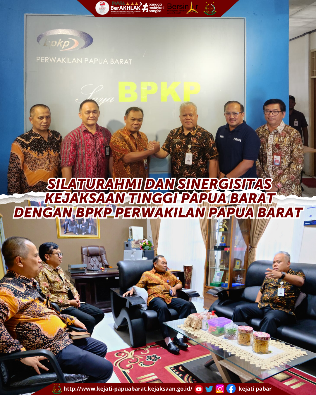 Kepala Kejaksaan Tinggi Papua Barat, Dr. Harli Siregar, S.H., M.Hum melakukan kunjungan kerja dan bersilaturahmi dengan Kepala Perwakilan BPKP Provinsi Papua Barat, Zainuri bertempat di Kantor Perwakilan BPKP Prov. Papua Barat, Jumat 7 Juli 2023.