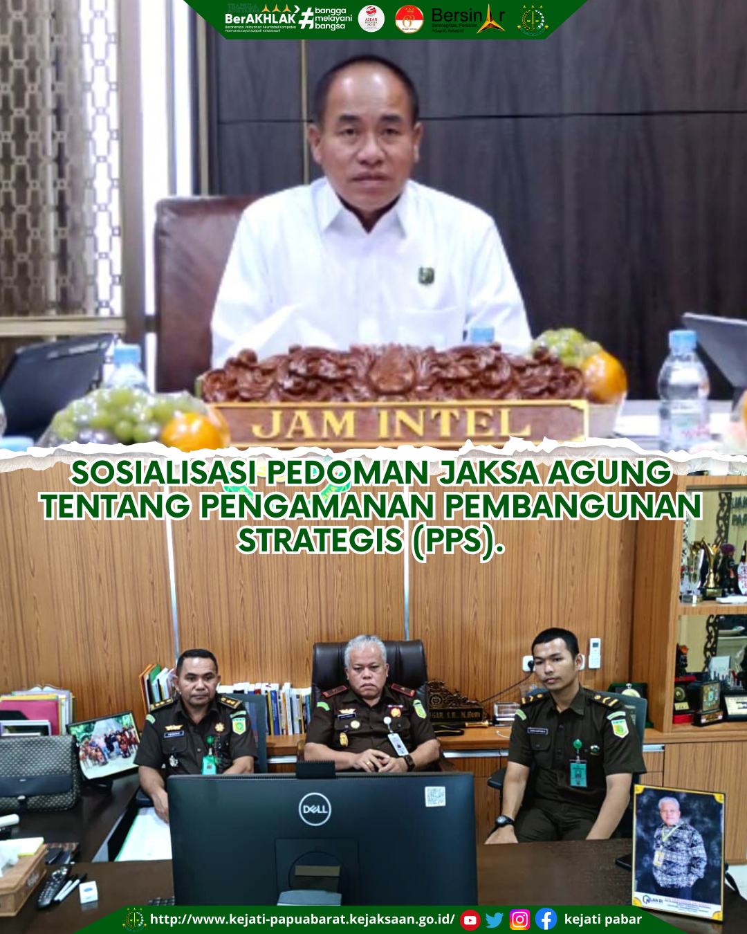 Senin, 24 Juli 2023 bertempat diruang vicon Jaksa Agung Muda Intelijen (JAM Intel) melakukan Sosialisasi Pedoman Jaksa Agung tentang Pengamanan Pembangunan Strategis (PPS) secara virtual kepada seluruh Kepala Kejaksaan, Kepala Kejaksaan Negeri dan Kepala Cabang Kejaksaan Negeri, Kepala Seksi PPS dan Kasi Intel se Indonesia.