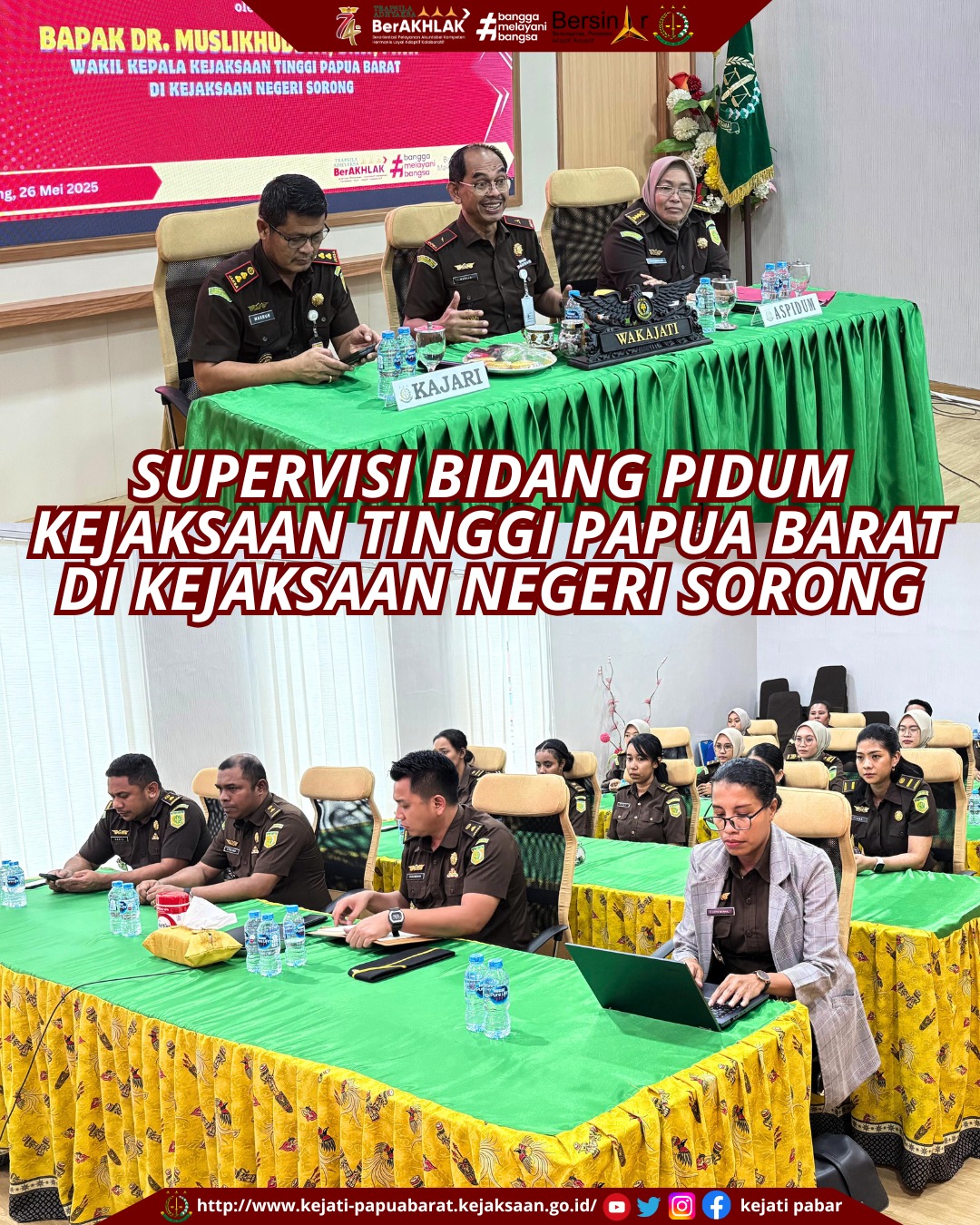 Senin 26 Mei 2025 bertempat di Aula Kejaksaan Negeri Sorong, dilaksanakan Supervisi Bidang Tindak Pidana Umum oleh Wakil Kepala Kejaksaan Tinggi Papua Barat Dr. Muslikhuddin, S.H., M.H. dan Asisten Tindak Pidana Umum Djasmaniar, S.H., M.H.