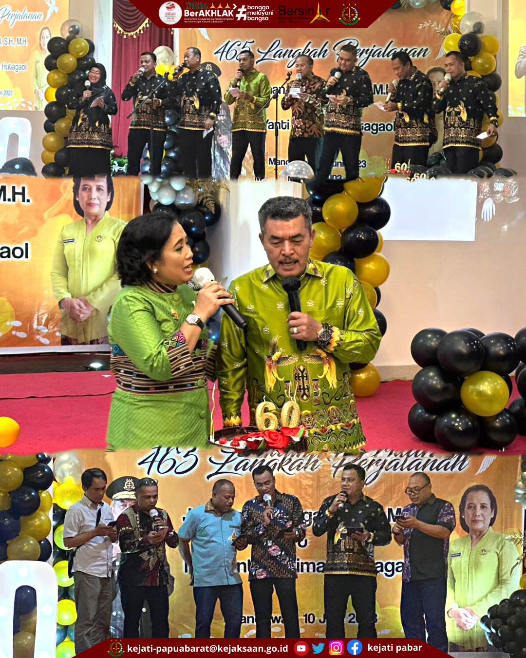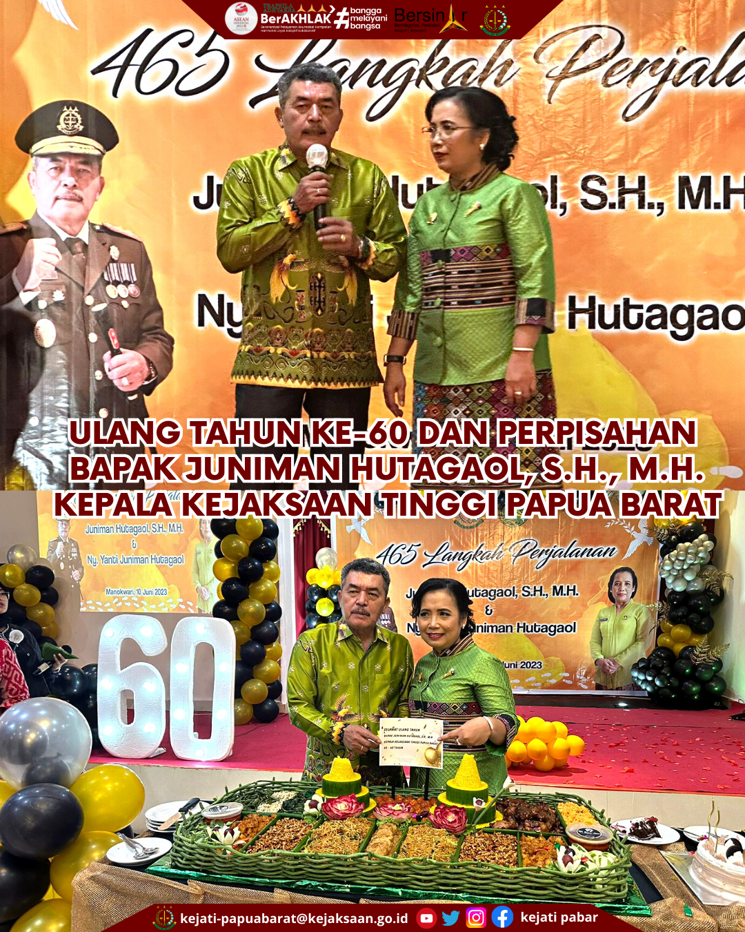 Syukuran Hari Ulang Tahun ke-60 Bapak Juniman Hutagaol, S.H., M.H Kepala Kejaksaan Tinggi Papua Barat dirangkai dengan perpisahan Bapak Juniman Hutagaol, S.H., M.H bersama Ibu Yanti Juniman, Ketua Ikatan Adhyaksa Darmakarini Wilayah Papua Barat. Sabtu 10 Juni 2023 bertempat di Hotel Mansinam Beach Manokwari.