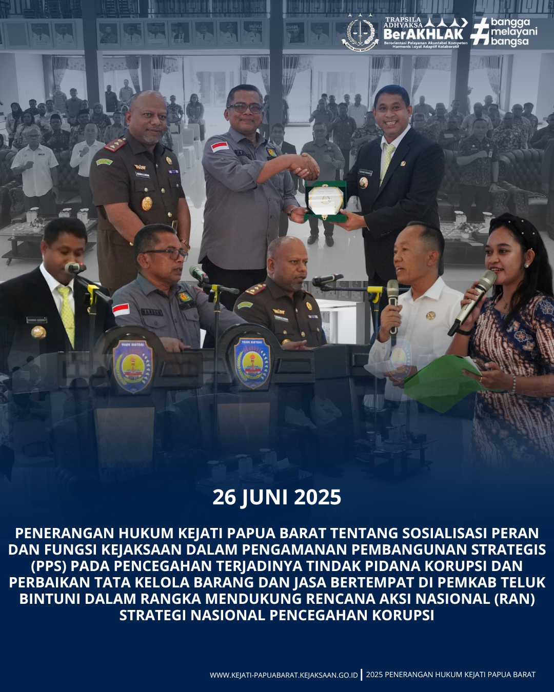 Pada hari Kamis, 26 Juni 2025 bertempat di Pemkab Teluk Bintuni telah dilaksanakan Penerangan Hukum Kejati Papua Barat tentang Sosialisasi Peran dan Fungsi Kejaksaan dalam Pengamanan Pembangunan Strategis (PPS) pada Pencegahan Terjadinya Tindak Pidana Korupsi dan Perbaikan Tata Kelola Barang dan Jasa dalam rangka mendukung Rencana Aksi Nasional (RAN) Strategi Nasional Pencegahan Korupsi.
