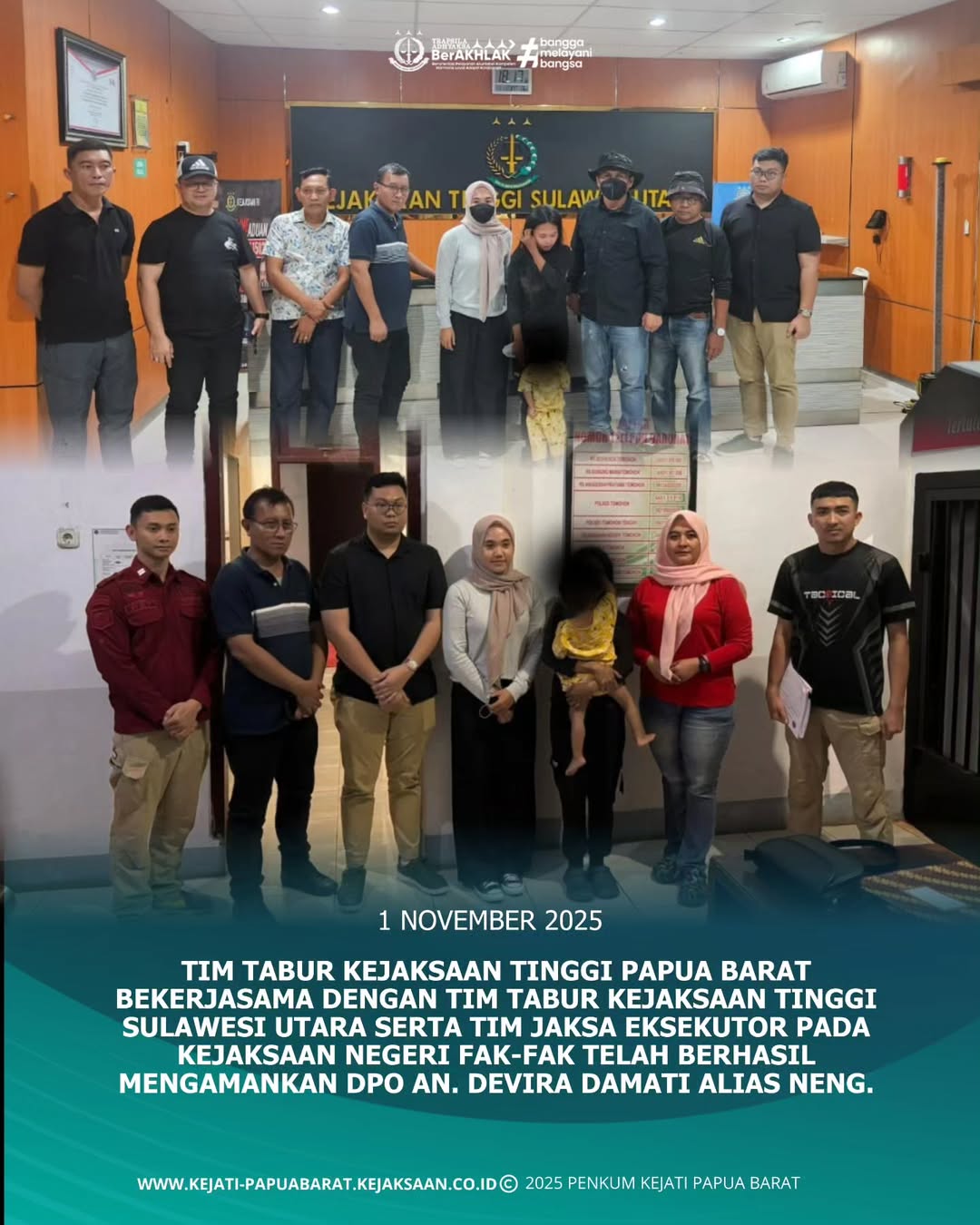 Pada hari Sabtu, tanggal 01 November 2025 sekira pukul 09:23 WITA. Tim Tabur Kejaksaan Tinggi Papua Barat bekerjasama dengan Tim Tabur Kejaksaan Tinggi Sulawesi Utara serta Tim Jaksa Eksekutor pada Kejaksaan Negeri Fak-Fak telah berhasil mengamankan DPO an. DEVIRA DAMATI alias NENG.