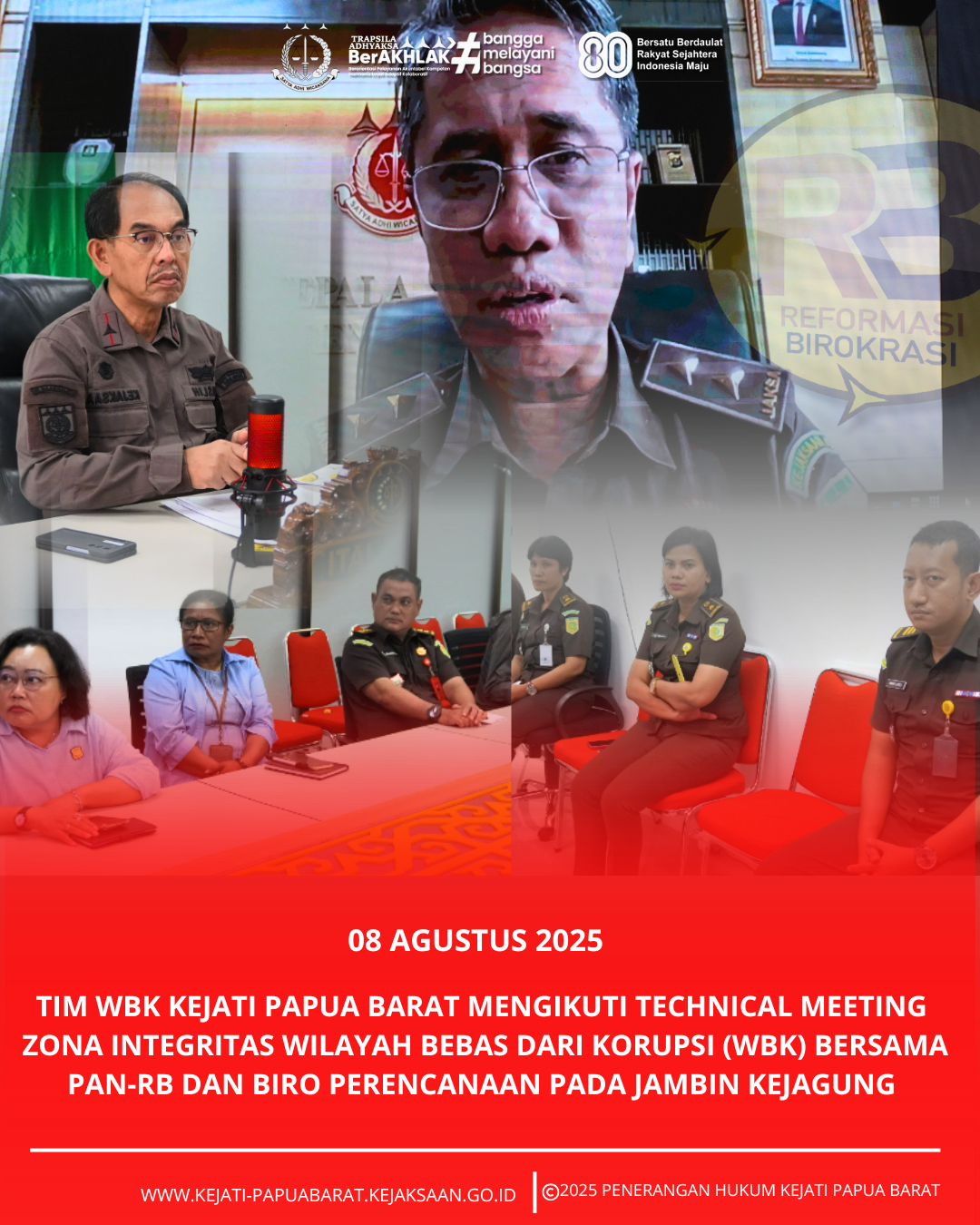 Jumat 08 Agustus 2025 bertempat di Ruang Vicon Lantai 2 Plh. Kepala Kejaksaan Tinggi Papua Barat bersama Tim WBK pada Kejaksaan Tinggi Papua Barat mengikuti Technical Meeting Zona Integritas Wilayah Bebas dari Korupsi (WBK) bersama PAN-RB dan Biro Perencanaan pada Jaksa Agung Muda Pembinaan Kejagung.