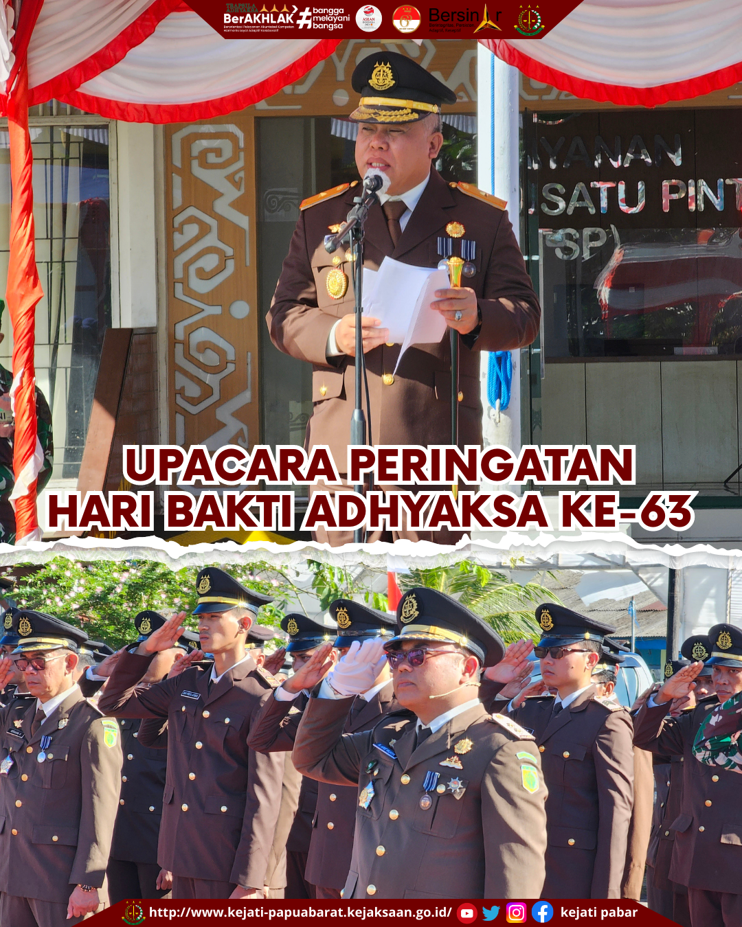Dalam sambutan Jaksa Agung R.I yang dibacakan Kajati Papua Barat menyampaikan Hari Bhakti Adhyaksa yang kita peringati tahun ini, jangan hanya dijadikan sekedar acara seremonial belaka, selayaknya kita hayati sebagai momentum untuk melakukan evaluasi dan introspeksi atas semua pelaksanaan tugas dan fungsi dalam kurun waktu satu tahun terakhir serta merumuskan strategi untuk kita laksanakan ke depan demi kepentingan masyarakat, bangsa, dan negara. Untuk itu mari kita jadikan momen ini sebagai pengingat untuk terus berbenah diri, merapatkan barisan, memperkuat jiwa korsa, dan terus memupuk semangat dalam bekerja dan berkarya dalam mempersiapkan diri menyongsong tantangan dan hambatan yang akan menghadang di hari esok. Saudara-Saudara Sekalian, Hadirin Peserta Upacara yang Berbahagia, Perjalanan panjang dalam penegakan hukum telah dilalui oleh Kejaksaan. Dalam rezim penegakan hukum Indonesia, Kejaksaan pada awalnya berada dibawah lembaga Kementerian Kehakiman yang menjalankan fungsi yang berkaitan dengan kekuasaan kehakiman yang satu atap dengan Mahkamah Agung. Seiring dengan berkembangnya sistem