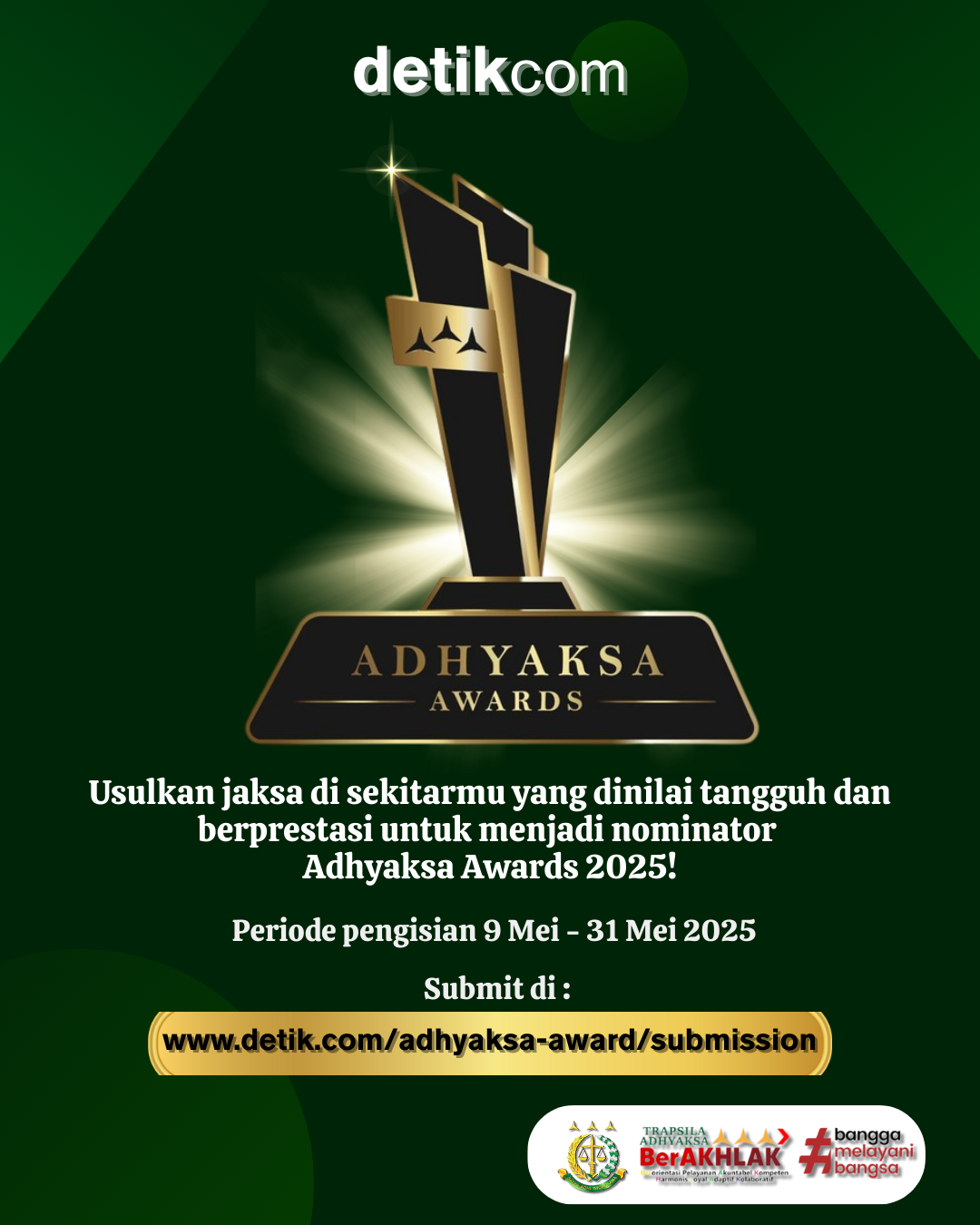 Ayo Usulkan jaksa di sekitarmu yang dinilai tangguh dan berprestasi untuk menjadi nominator Adhyaksa Awards 2025 melalui laman https://www.detik.com/adhyaksa-awards/submission