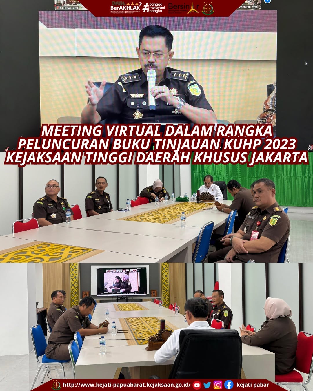 Rabu, 05 Februari 2024 bertempat di Ruang Vicon Lantai 2 kantor Kejaksaan Tinggi Papua Barat. Wakil Kepala Kejaksaan Tinggi Papua Barat Dr. Muslikhuddin, S.H., M.H. beserta jajaran mengikuti Meeting Virtual dalam rangka Peluncuran BUku Tinjauan KUHP 2023 Kejaksaan Tinggi Daerah Khusus Jakarta.