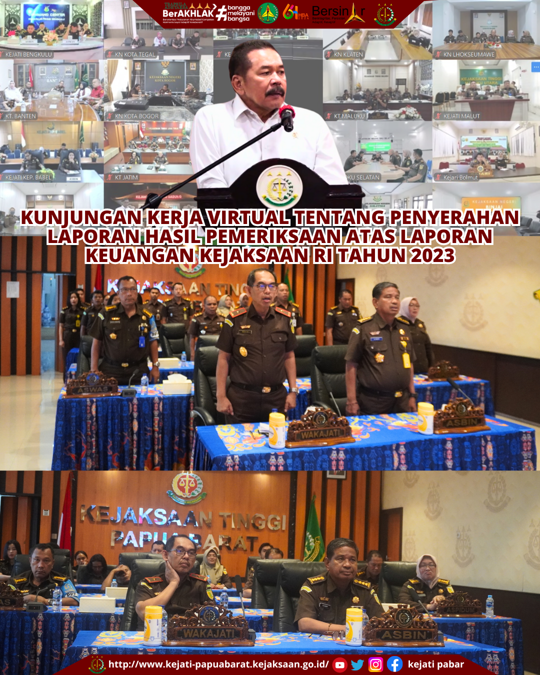 Wakil Kepala Kejaksaan Tinggi Papua Barat Dr. Muslikhuddin, S.H., M.H. beserta para asisten dan Staff Kejaksaan Tinggi Papua Barat mengikuti Rapat Kunjungan Kerja Virtual dengan Kejaksaan Agung tentang “Penyerahan Laporan Hasil Pemeriksaan Atas Laporan Keuangan Kejaksaan Republik Indonesia Tahun 2023 dan Pemaparan Temuan Laporan Keuangan. Kegiatan bertempat di Aula Kejaksaan Tinggi Papua Barat, Rabu 24 Juli 2024, pukul 16.00 WIT s.d. 17.00 WIT.
