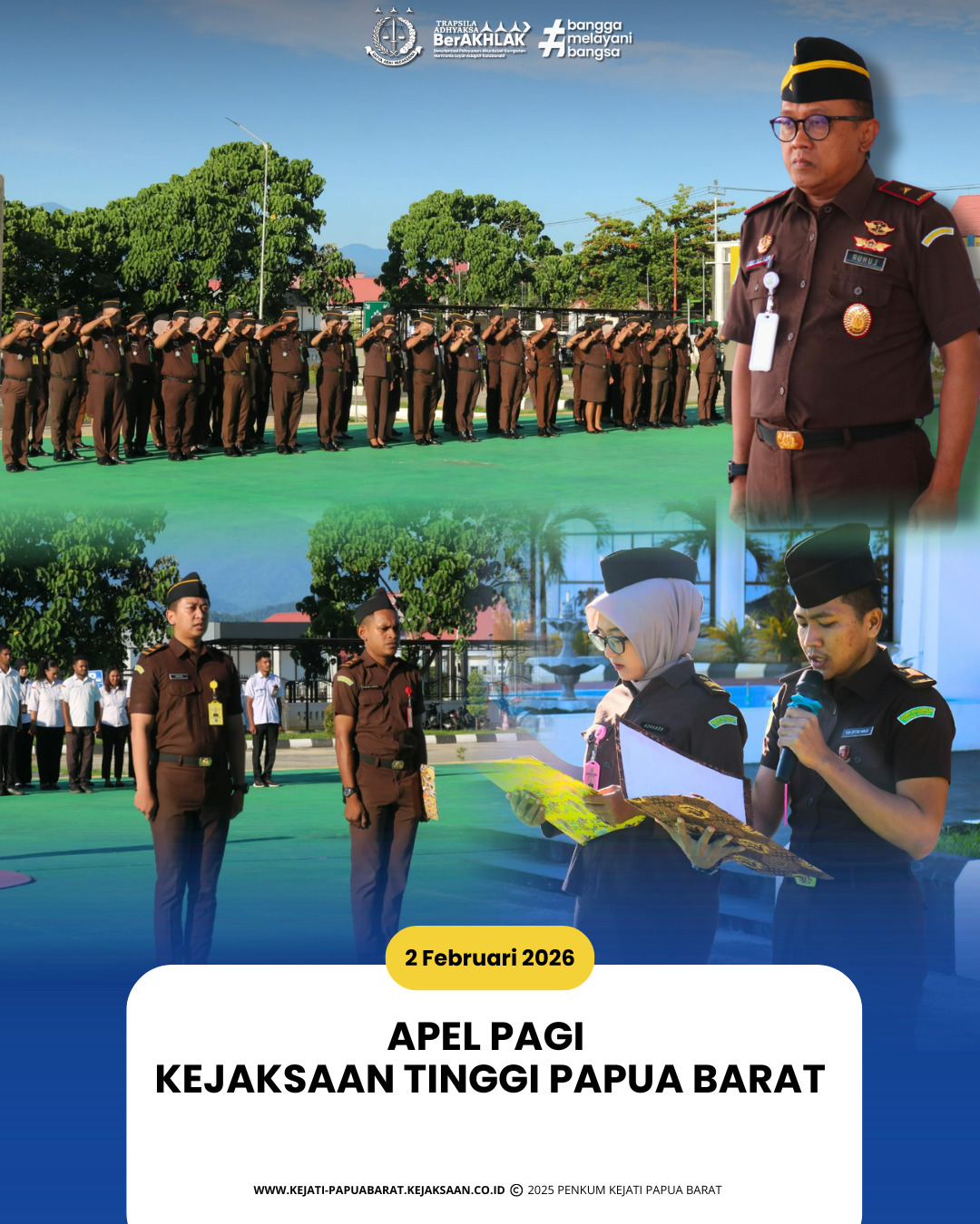 Senin, 2 Februari 2026 pukul 07.30 WIT, bertempat di Lapangan Apel Kantor Kejaksaan Tinggi Papua Barat, Wakil Kepala Kejaksaan Tinggi Papua Barat Luhur Istighfar, S.H., M.Hum. selaku Pengambil Apel, memimpin Apel Pagi Kejaksaan Tinggi Papua Barat.