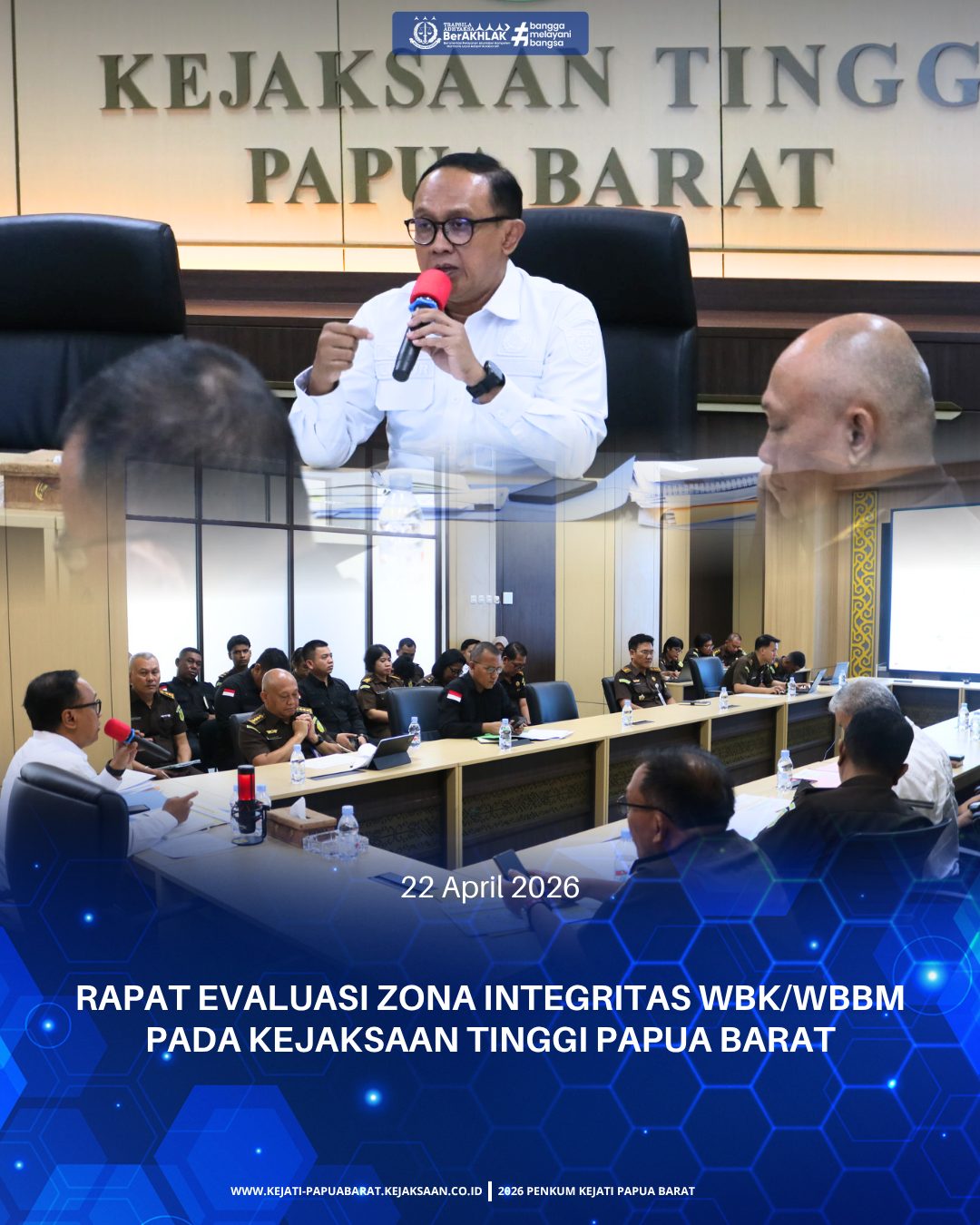 Rabu, 22 April 2026 pukul 09.00 WIT bertempat di Ruang Vicon Lantai 2 Kantor Kejaksaan Tinggi Papua Barat, Wakil Kepala Kejaksaan Tinggi Papua Barat Luhur Istighfar, S.H., M.H. memimpin Rapat Evaluasi Zona Integritas WBK/ WBBM pada Kejaksaan Tinggi Papua Barat.