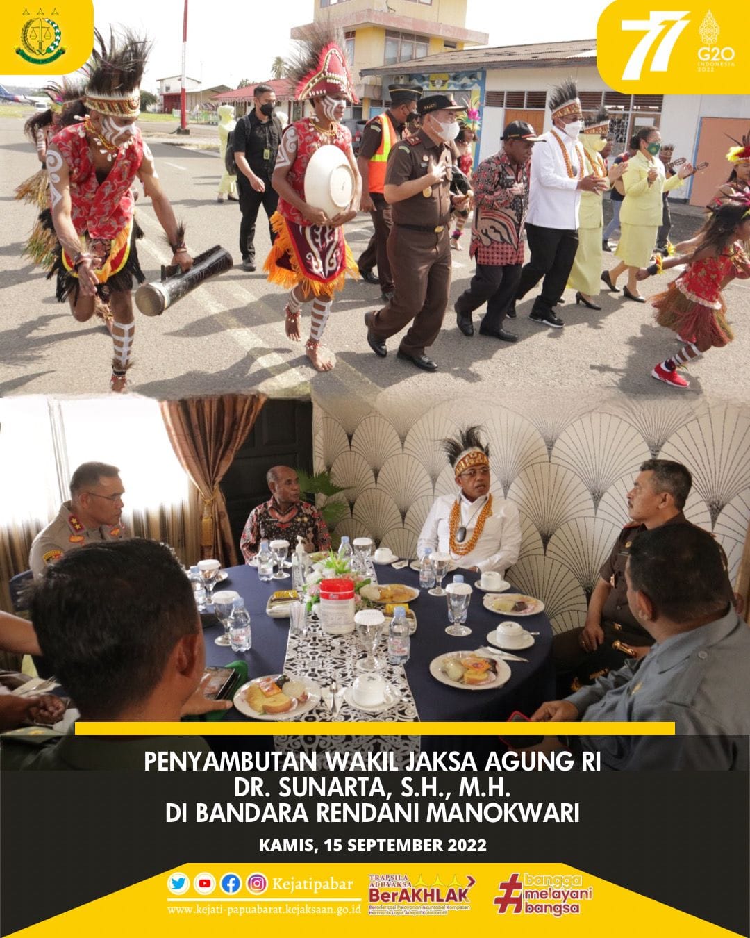 Wakil Jaksa Agung bersama rombongan disambut Kepala Kejaksaan Tinggi Papua Barat, Juniman Hutagaol,S.H., M.H bersama jajaran dan unsur Forkopimda Papua Barat di Bandar Udara Rendani Manokwari Kamis 15 September 2022.