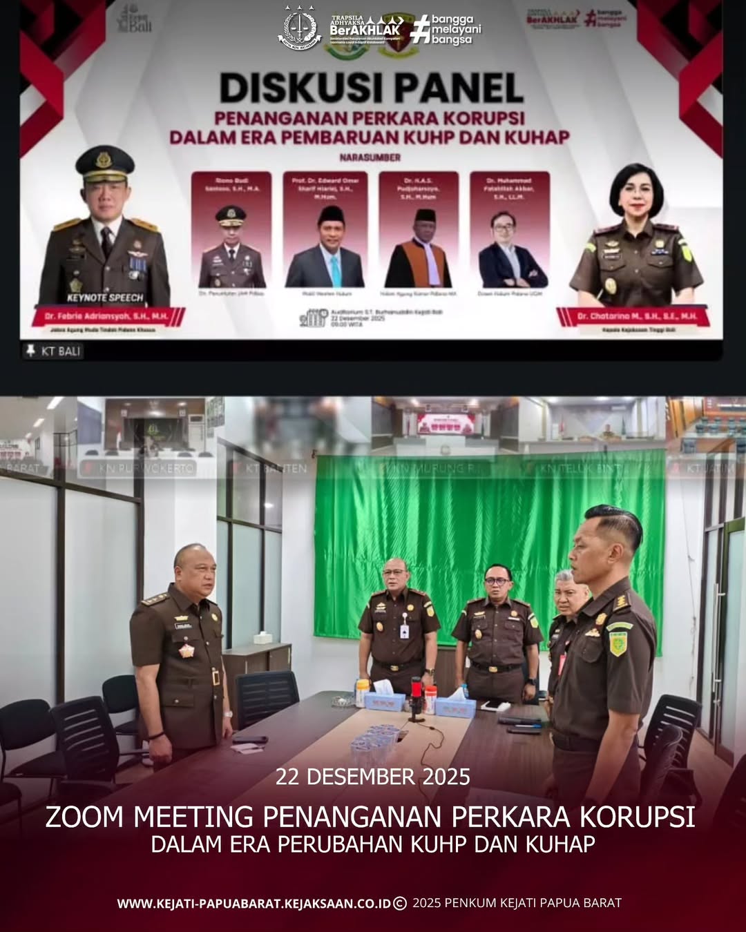 Pada hari Senin, 22 Desember 2025 bertempat di ruang Vicon lantai 2 Kantor Kejaksaan Tinggi Papua Barat, telah dilaksanakan kegiatan Pembahasan Pemberlakuan KUHP dan KUHAP yang diselenggarakan Kejaksaan Tinggi Bali dengan Keynote speech Jaksa Agung Muda Tindak Pidana Khusus, bersama ini diberitahukan kepada para Kepala Kejaksaan Tinggi, Asisten Tindak Pidana Khusus, Kepala Kejaksaan Negeri, Kepala Cabang Kejaksaan Negeri, Kasi Tindak Pidana Khusus dan Jaksa Fungsional untuk mengikuti kegiatan Diskusi Panel dengan tema “Penanganan Perkara Korupsi dalam Era Pembaruan KUHP dan KUHAP” secara virtual.
